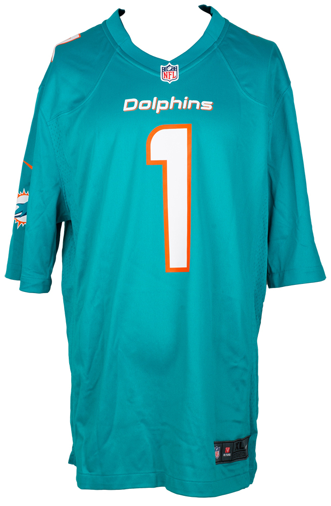 Nike style jersey. Everything is sewn on, size XL. Hand-signed by Tua Tagovailoa (Miami Dolphins).