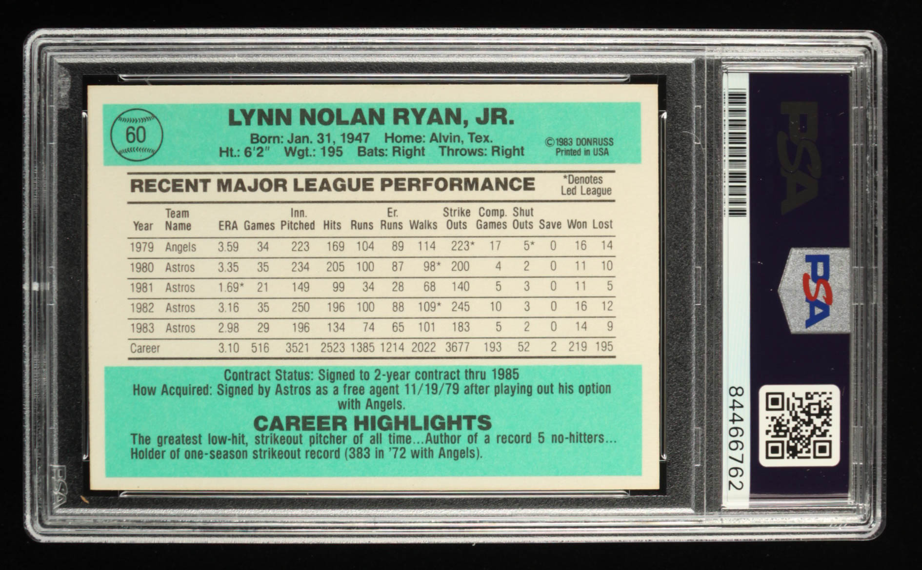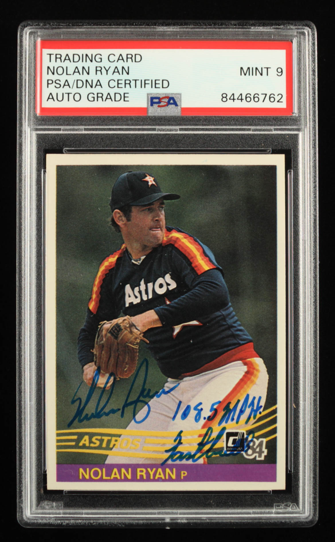 Nolan Ryan Signed 1984 Donruss #60 Inscribed "108.5 MPH Fastball" (PSA Encapsulated)