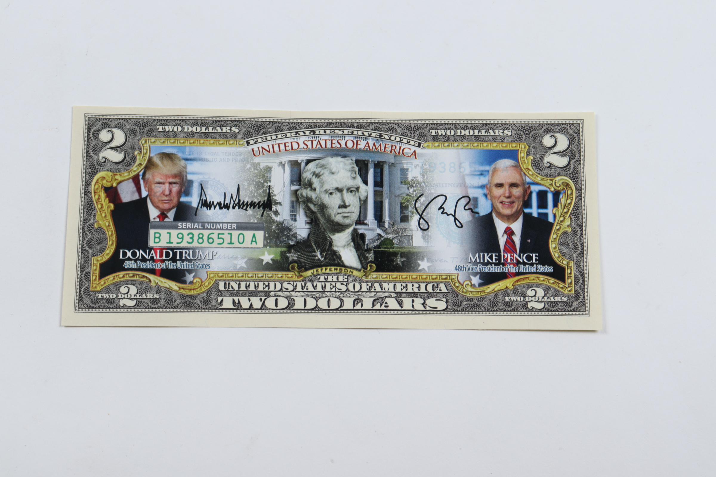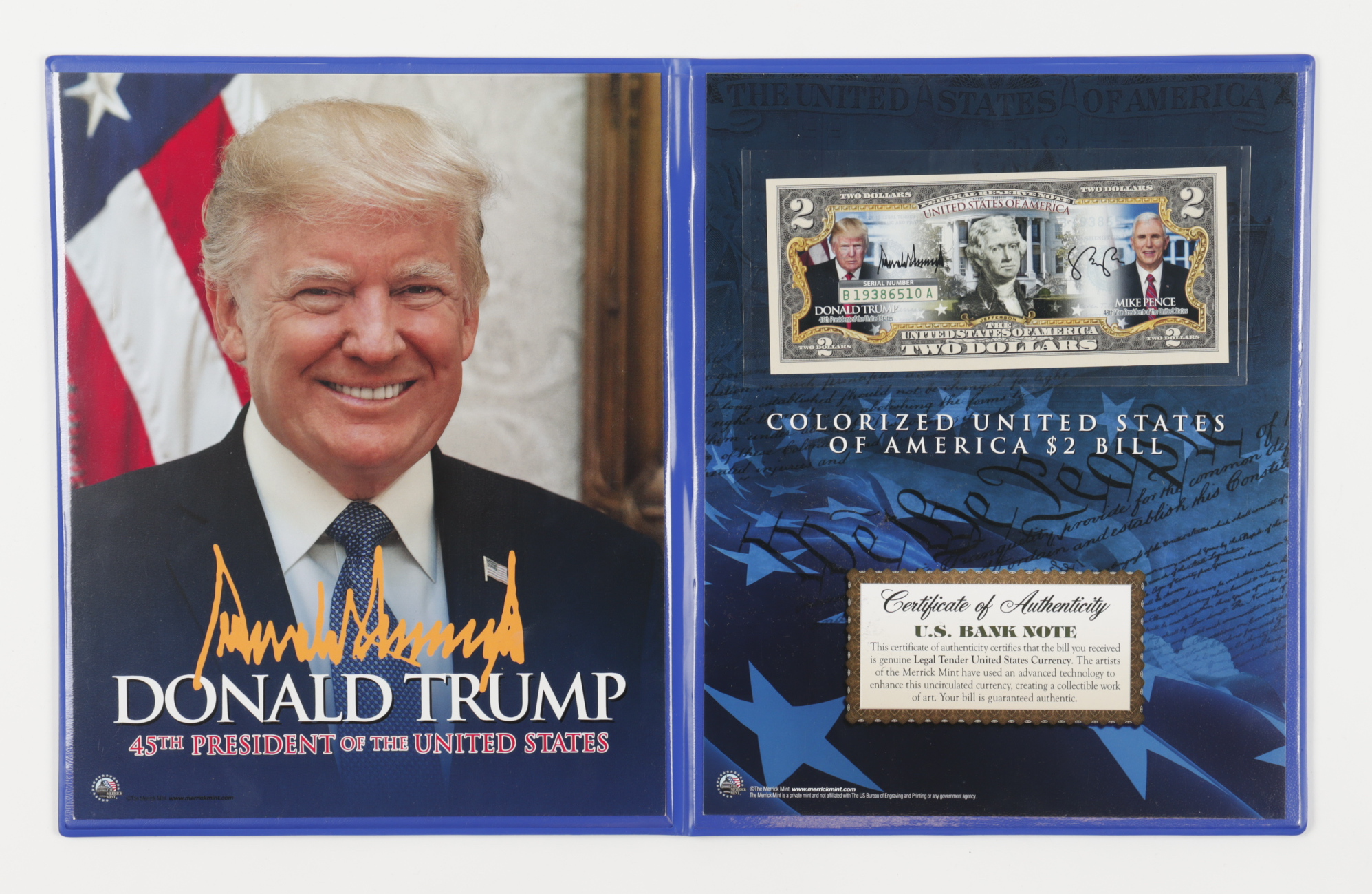 Donald Trump Genuine Legal Tender Colorized U.S. $2 Bill Commemorative Edition Bank Note. Includes folder as shown.