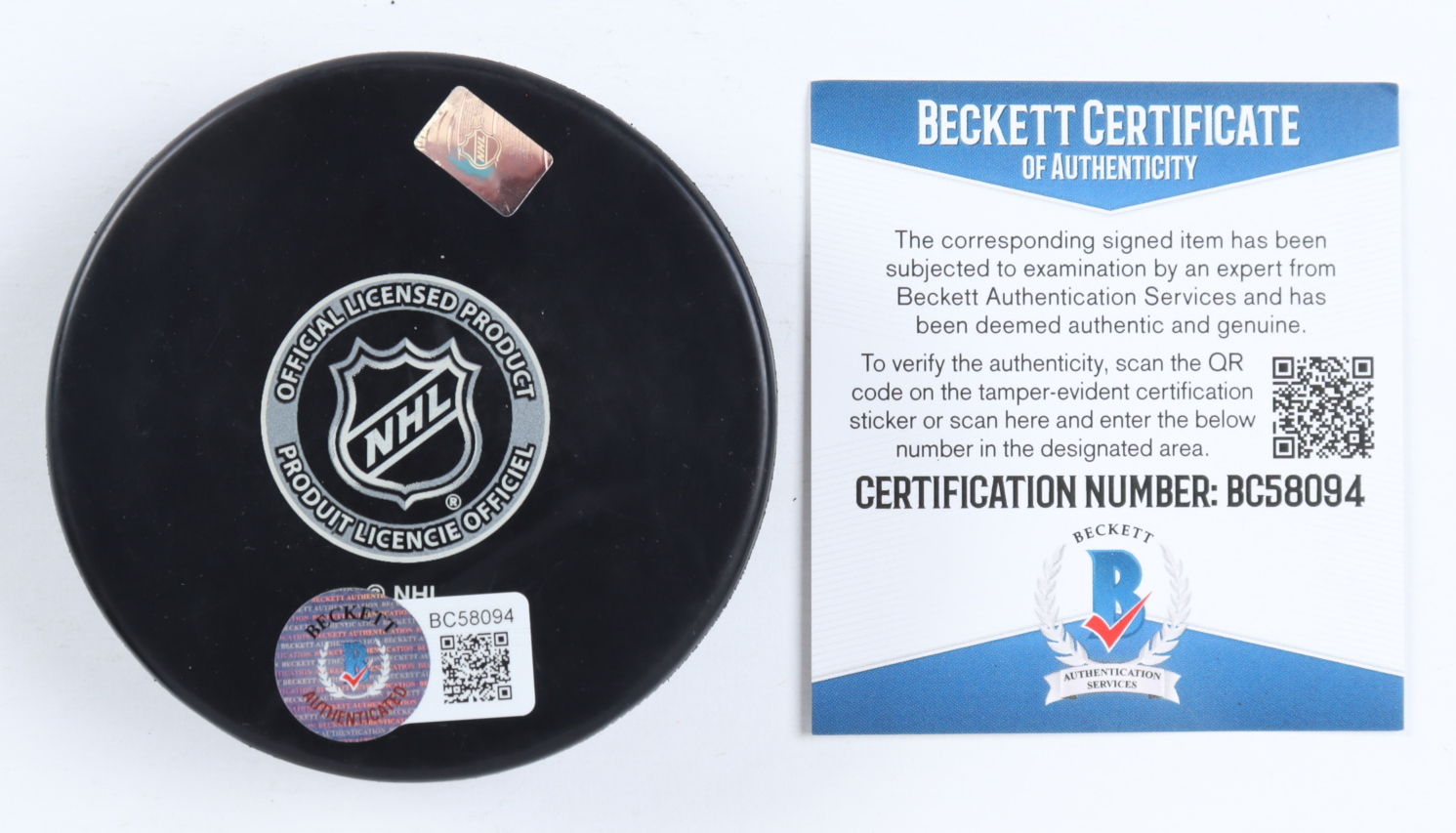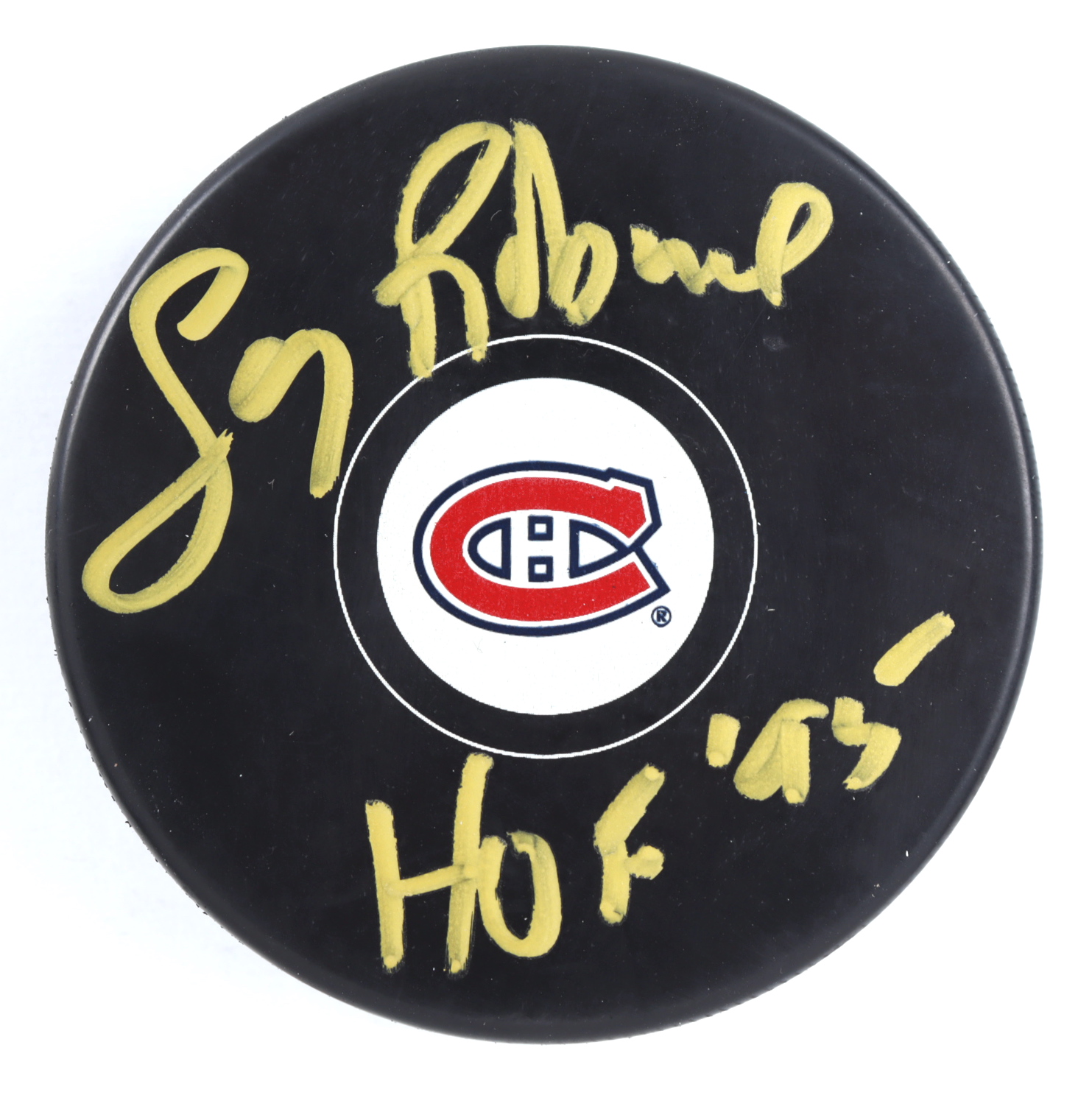 Montreal Canadiens logo hockey puck. Hand-signed and inscribed by Larry Robinson (HOF).