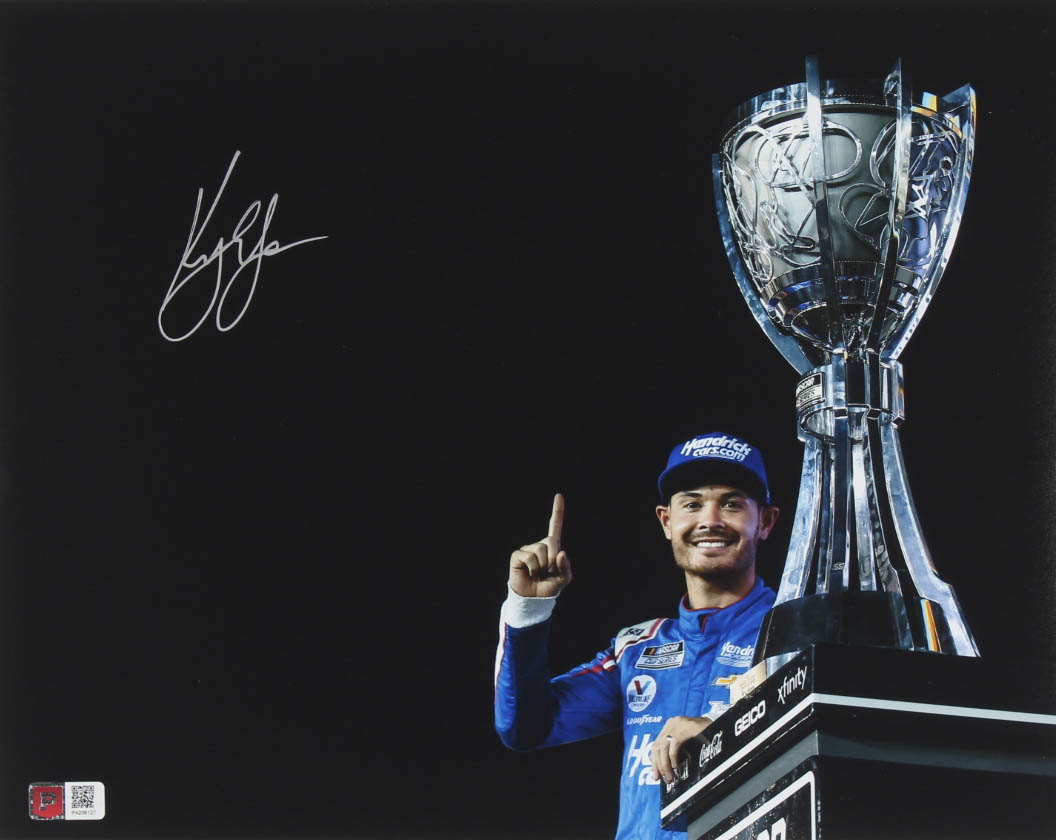 Photo measures 11" x 14" in size and is hand-signed by NASCAR Cup Champion Kyle Larson.