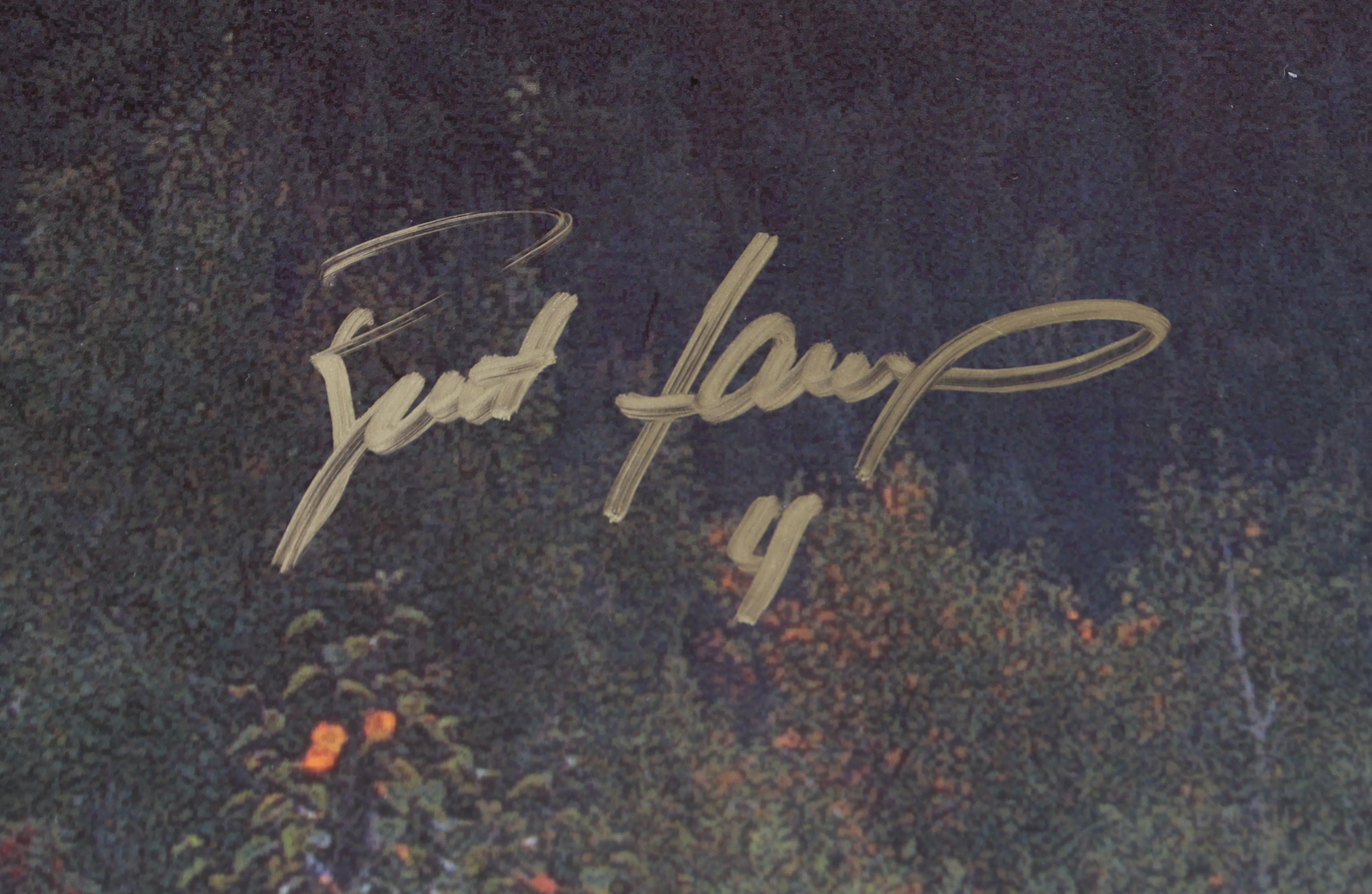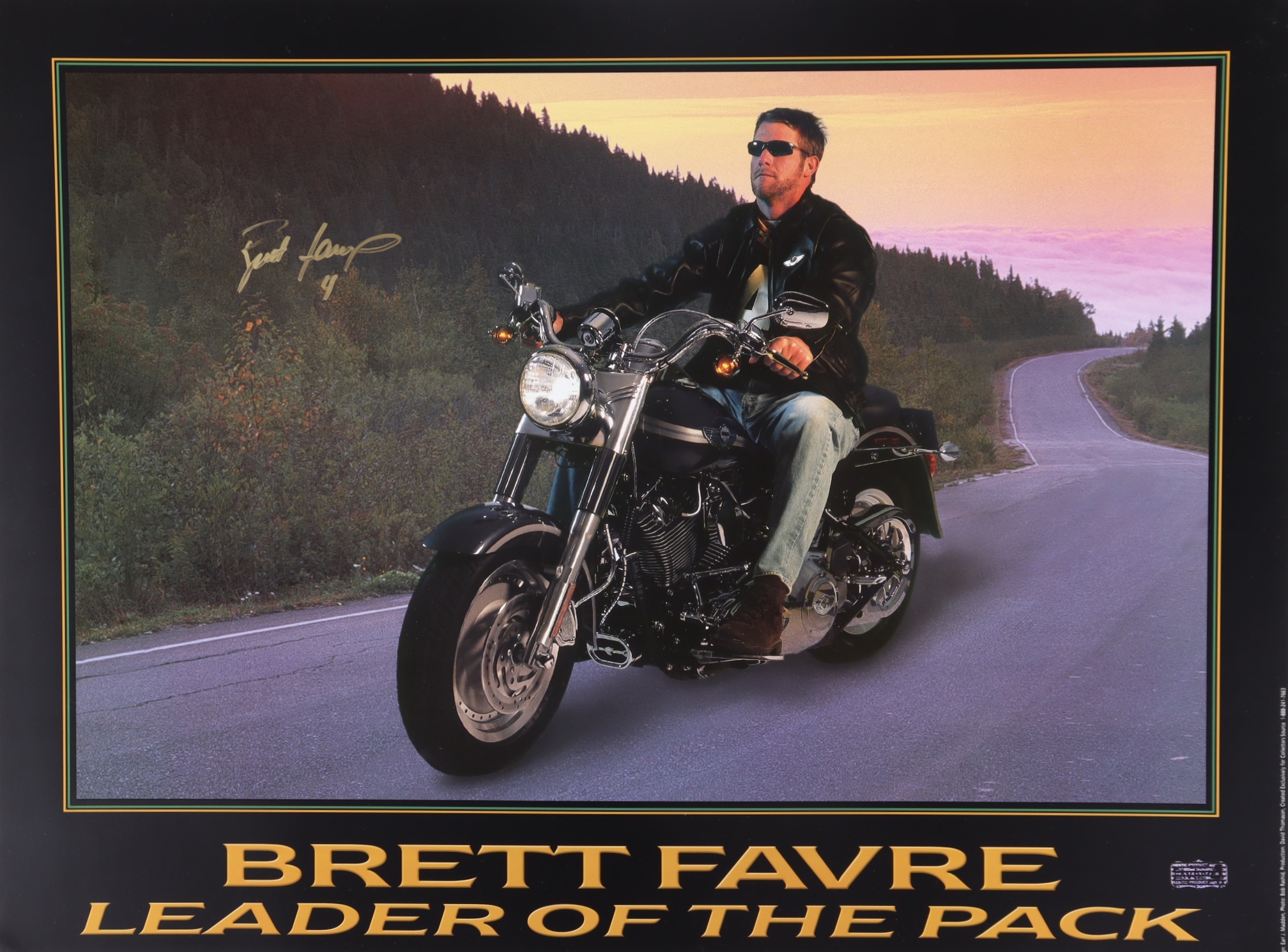 Photo measures 18" x 24" in size. Hand-signed by Brett Favre (Green Bay Packers, HOF). Please note, the photo shows signs of handling and wear. See images for more details.