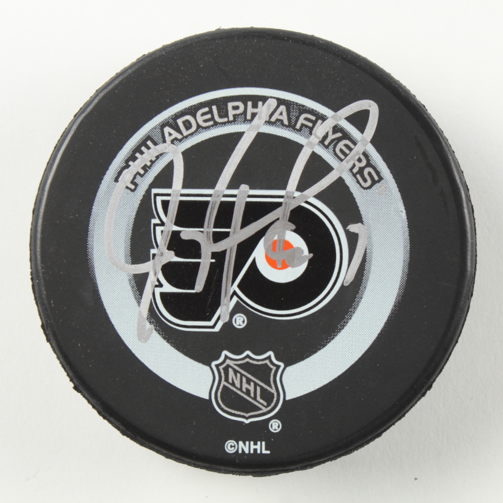 Philadelphia Flyers logo hockey puck. Hand-signed by Jeremy Roenick.