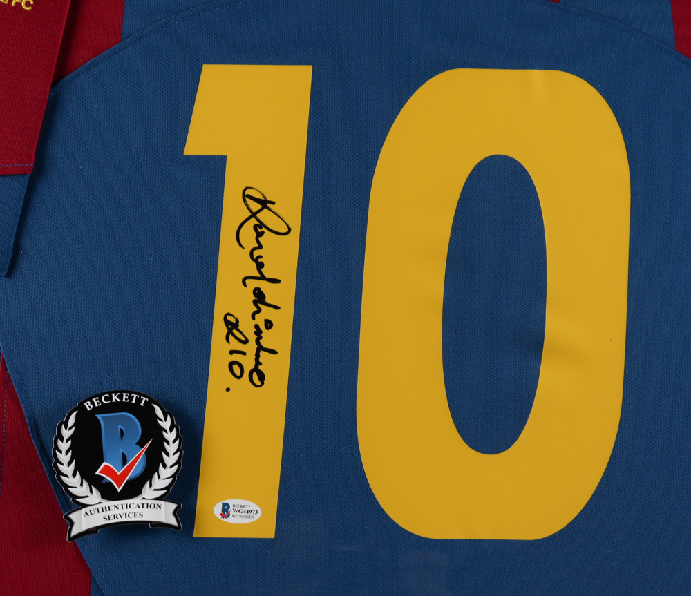 Custom frame measures 35" x 43" in size and features a jersey hand-signed and inscribed by Ronaldinho.