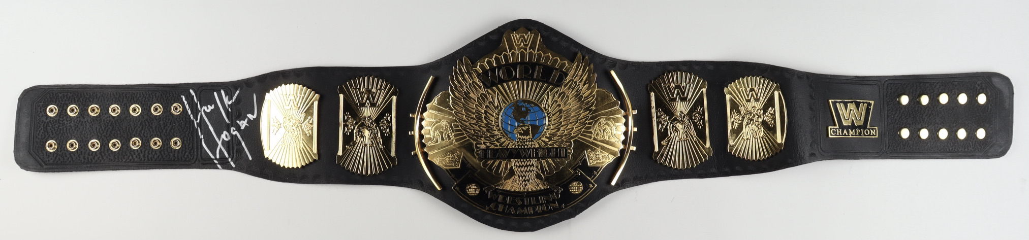Replica WWE Championship Belt measures 49.5" in size and has been hand-signed by Hulk Hogan (HOF).