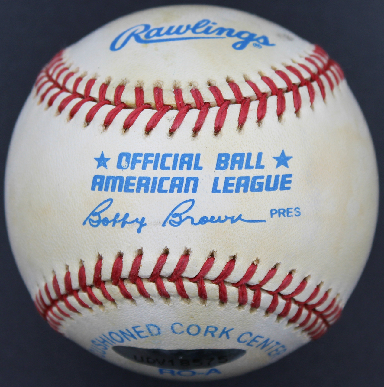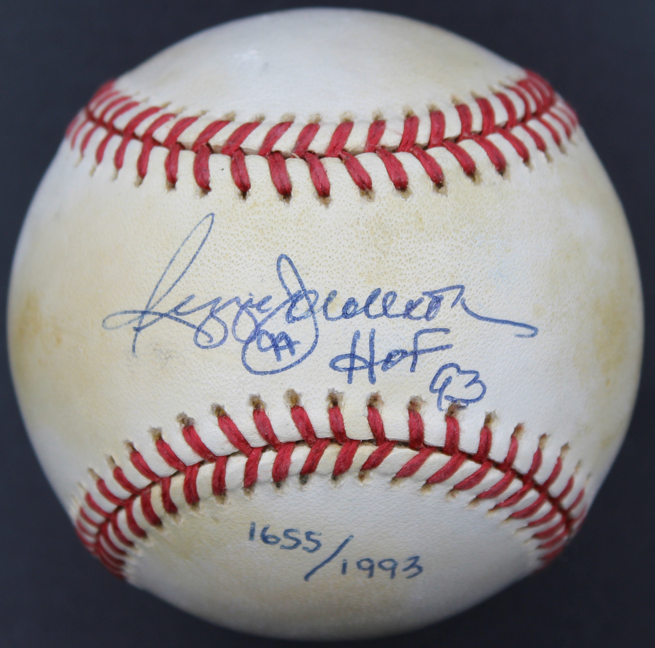 Rawlings Official American League baseball. Hand-signed and inscribed by Reggie Jackson (New York Yankees, HOF). The baseball is limited edition and has been numbered #1655/1993. Please note, ball shows signs of natural toning and has minor staining.