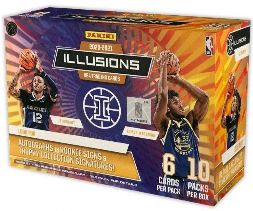 (10) Packs Per Box, (6) Cards Per Pack. 2020-21 Panini Illusions Basketball returns for round two of the NBA series. Look For Retail Exclusive Starlight Parallels Look For Autographs in Rookie Signs & Trophy Collection Signatures Very similar to the 2019-20 product, 2020-21 Panini Illusions Basketball offers a 200-card foil base set with multiple Trophy Collection parallels. Featuring NBA Rookies including Anthony Edwards, LaMelo Ball, James Wiseman, Deni Avdija, Obi Toppin, Killian Hayes, Immanuel Quickley, Tyrese Haliburton, Isaac Okoro, Patrick Williams, Devin Vassell, Precious Achiuwa, Jalen Smith, Aaron Nesmith, Saddiq Bey, Cole Anthony, R.J. Hampton, Kira Lewis Jr., Grant Riller, Jahmi'us Ramsey, Desmond Bane, and Tyrese Maxey!