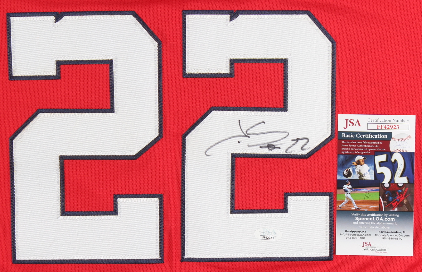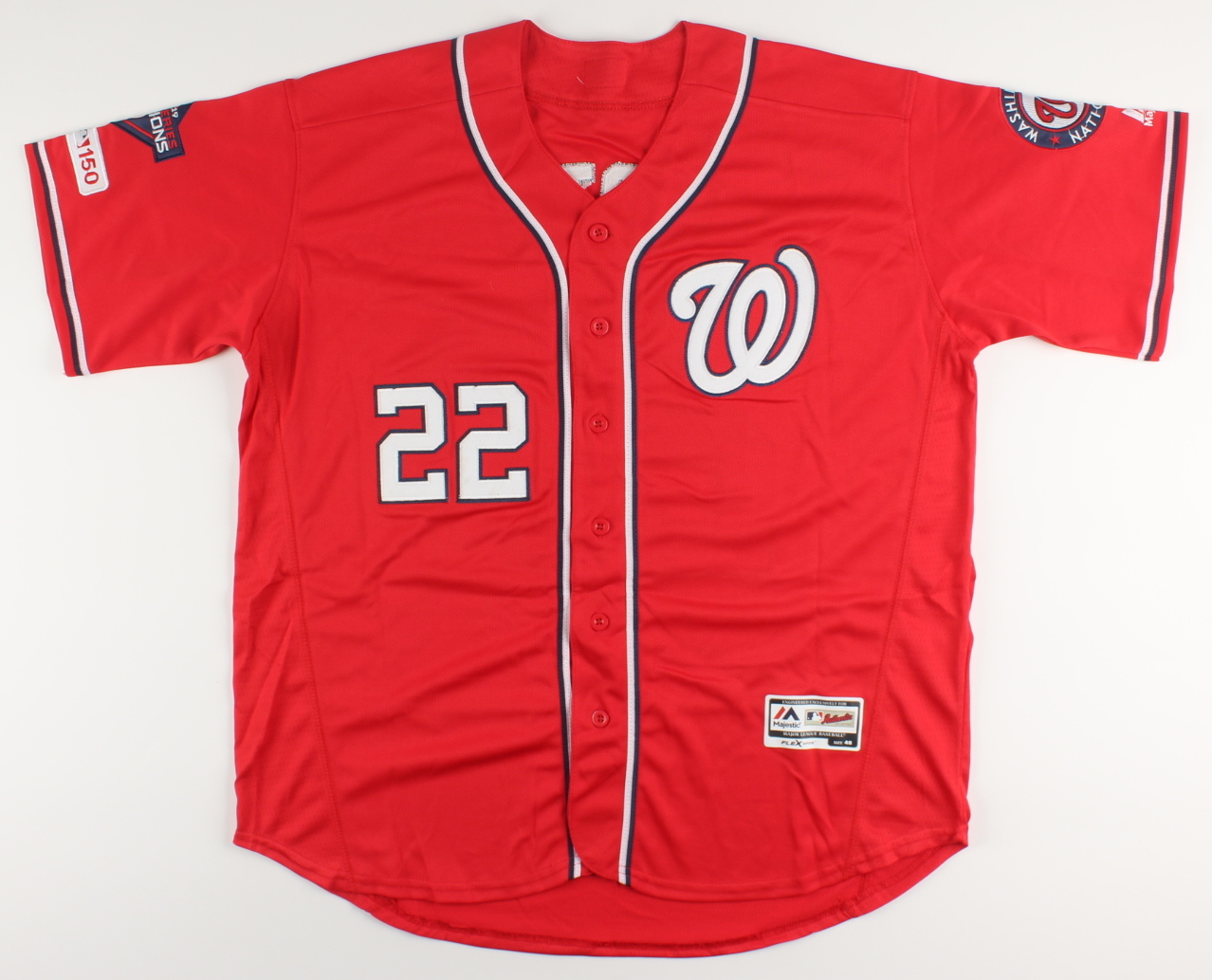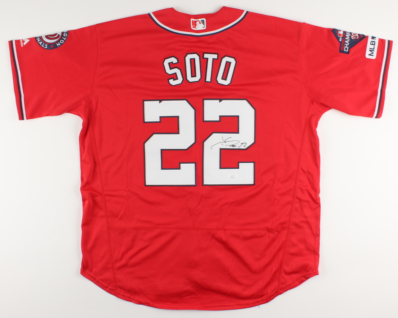 On-field style jersey. Everything is sewn on, size XL. Hand-signed by Juan Soto.