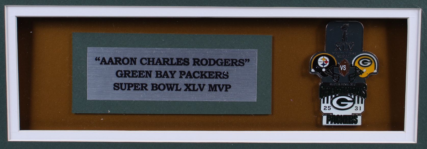 Custom frame measures approximately 32" x 36" in size. Features a custom Aaron Rodgers jersey. Display also includes a SBXLV Champions pin. Please note, the display is unsigned.