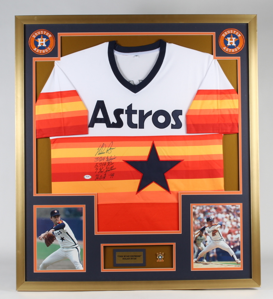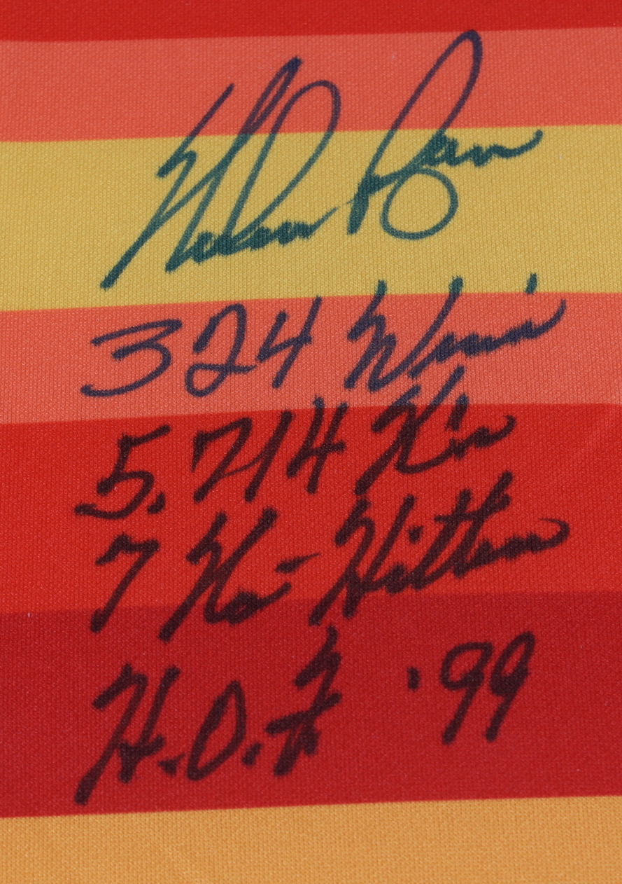 Nolan Ryan Signed 32x36 Custom Framed Jersey Display with Multiple Inscriptions with 1999 Hall of Fame Induction Pin (PSA)