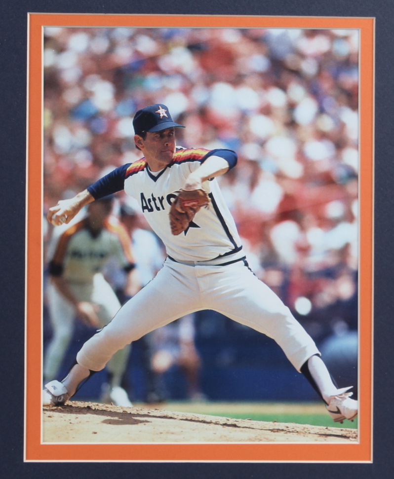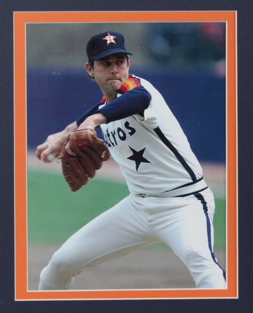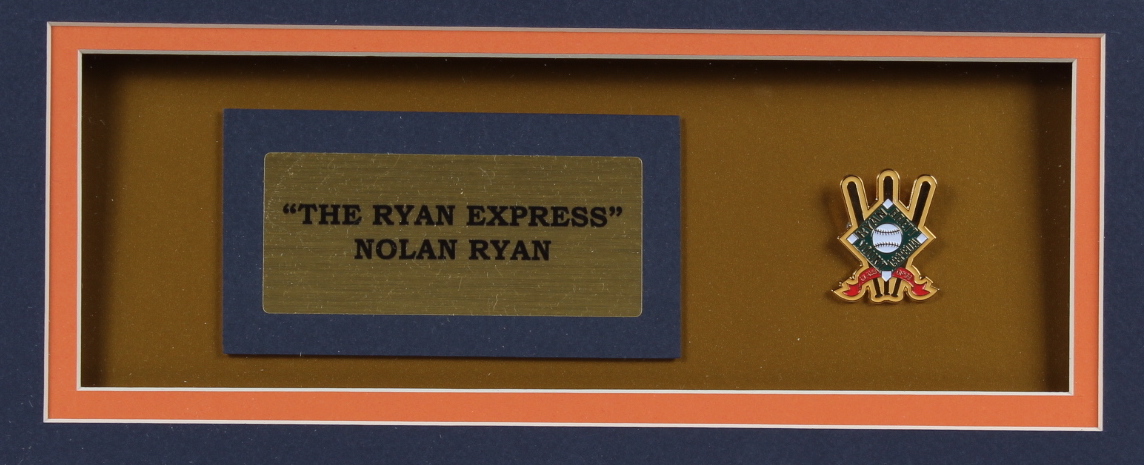 Custom framed display measures 32" x 36" in size and features a jersey that has been hand-signed and inscribed by Nolan Ryan (HOF). Also included in the display a 1999 Hall of Fame induction pin.