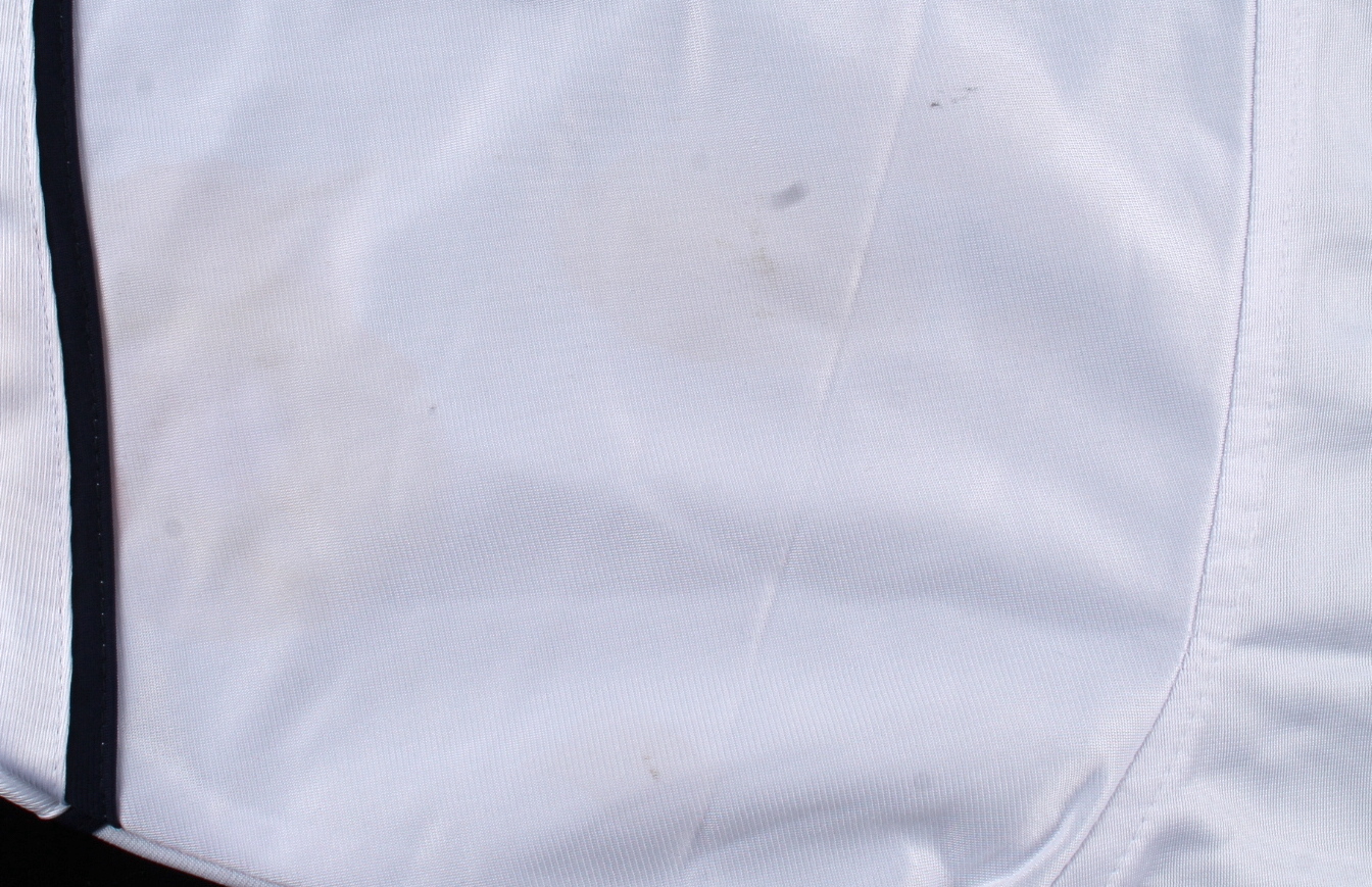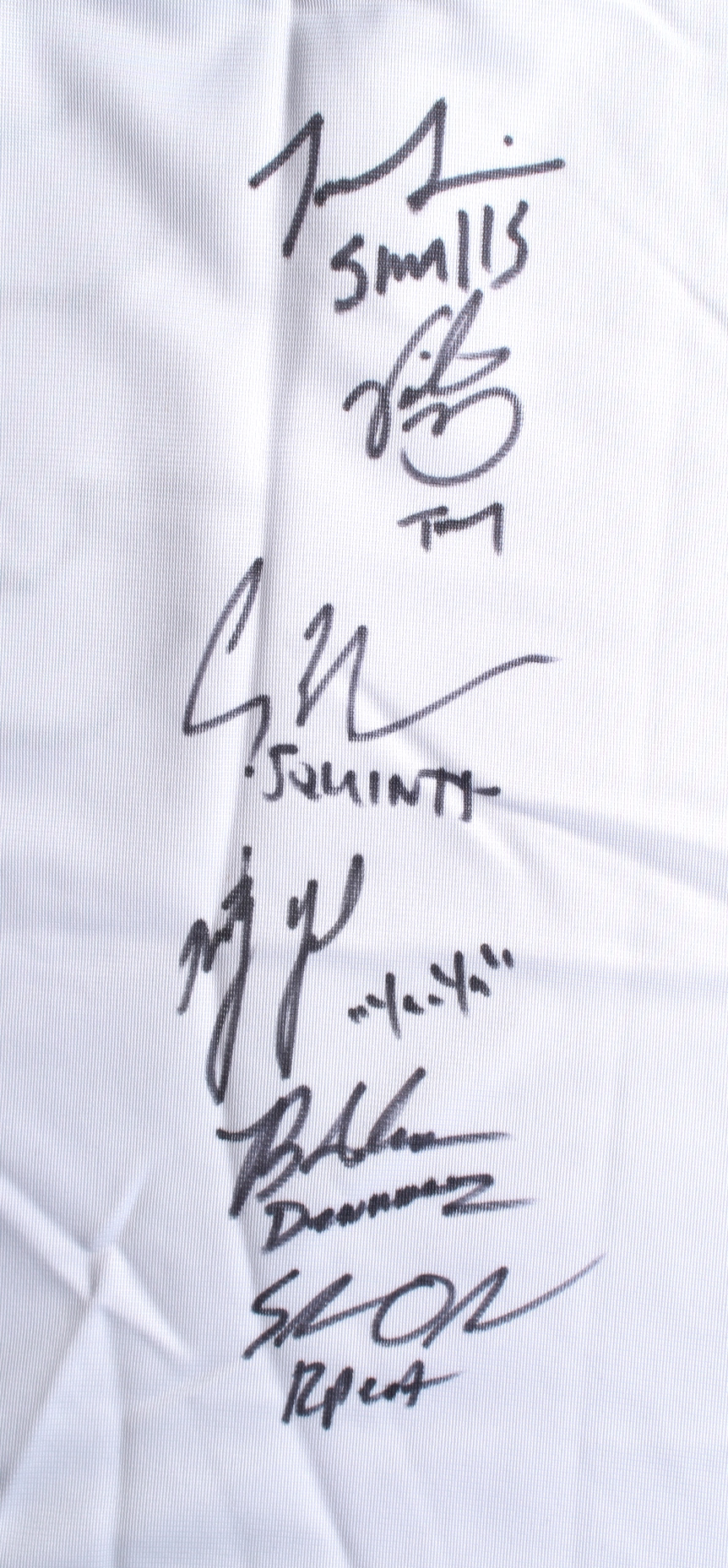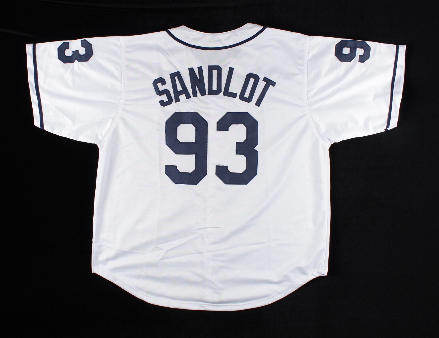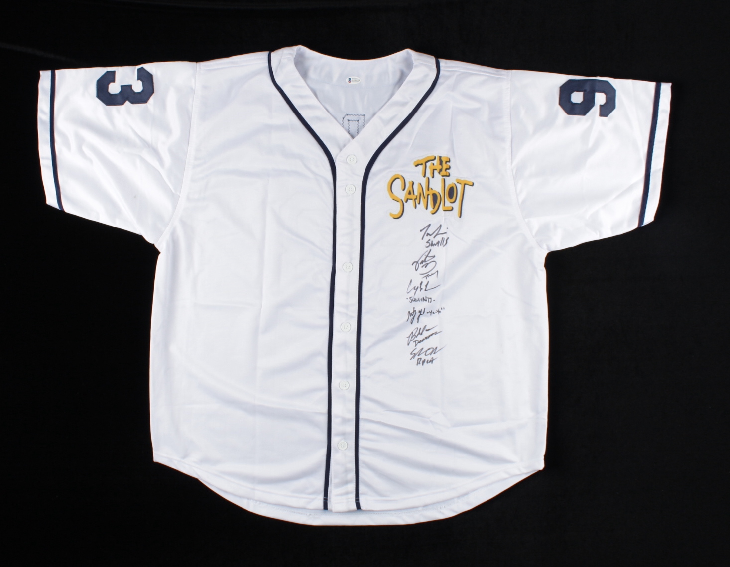 Custom on-field style jersey. Everything is sewn on, size XL. Hand-signed and inscribed by Tom Guiry ("Smalls"), Chauncey Leopardi ("Squints"), Marty York ("Yeah-Yeah"), Brandon Adams (Kenny DeNenez), Victor Di Mattia (Timmy Timmons), and Shane Obedzinski (Tommy "Repeat" Timmons). Please note, staining on the reverse left sleeve and front of jersey.