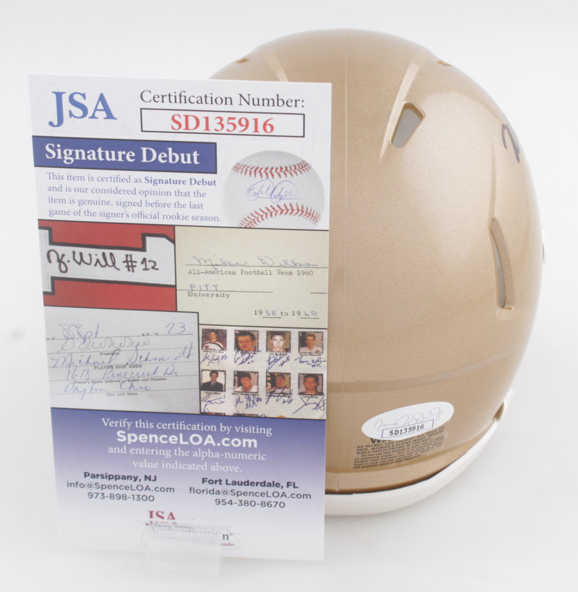 The autograph(s) includes an official James Spence Authentication (JSA) "Signature Debut" hologram and COA. "Signature Debut" is the autographed memorabilia equivalent to a rookie card. The JSA definition of a "Signature Debut" is as follows: "Any item that is autographed and received by JSA prior to the last game of the signer's official rookie season.