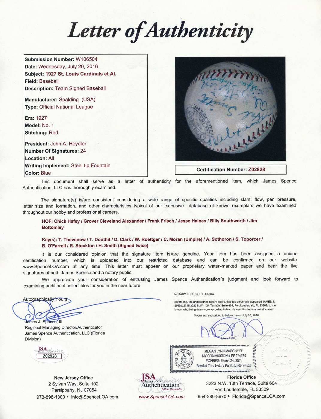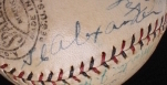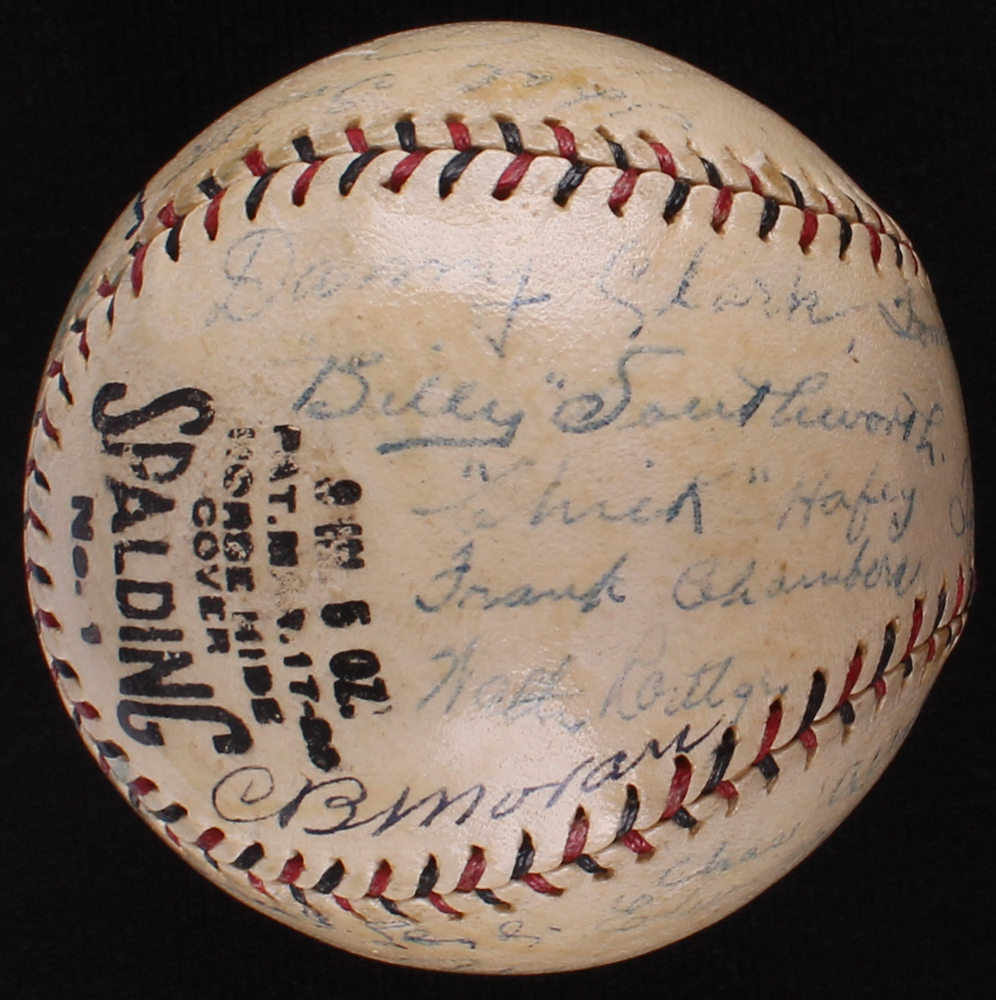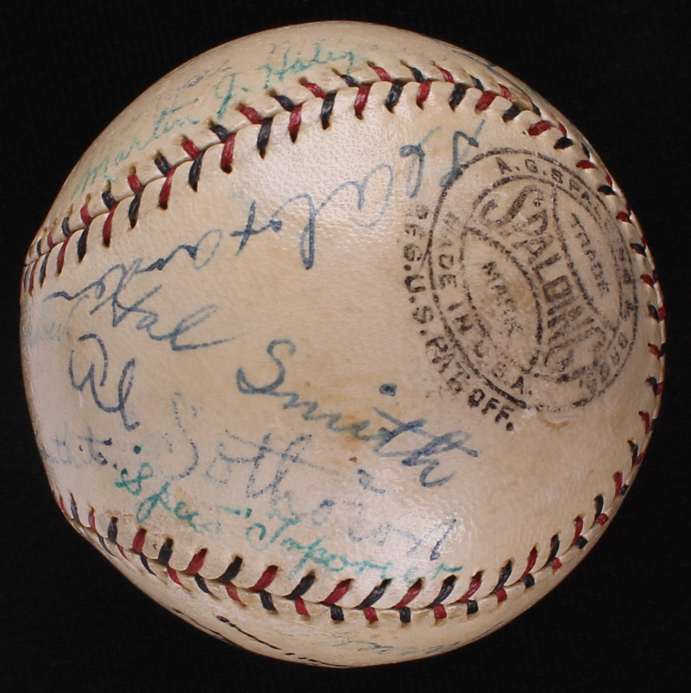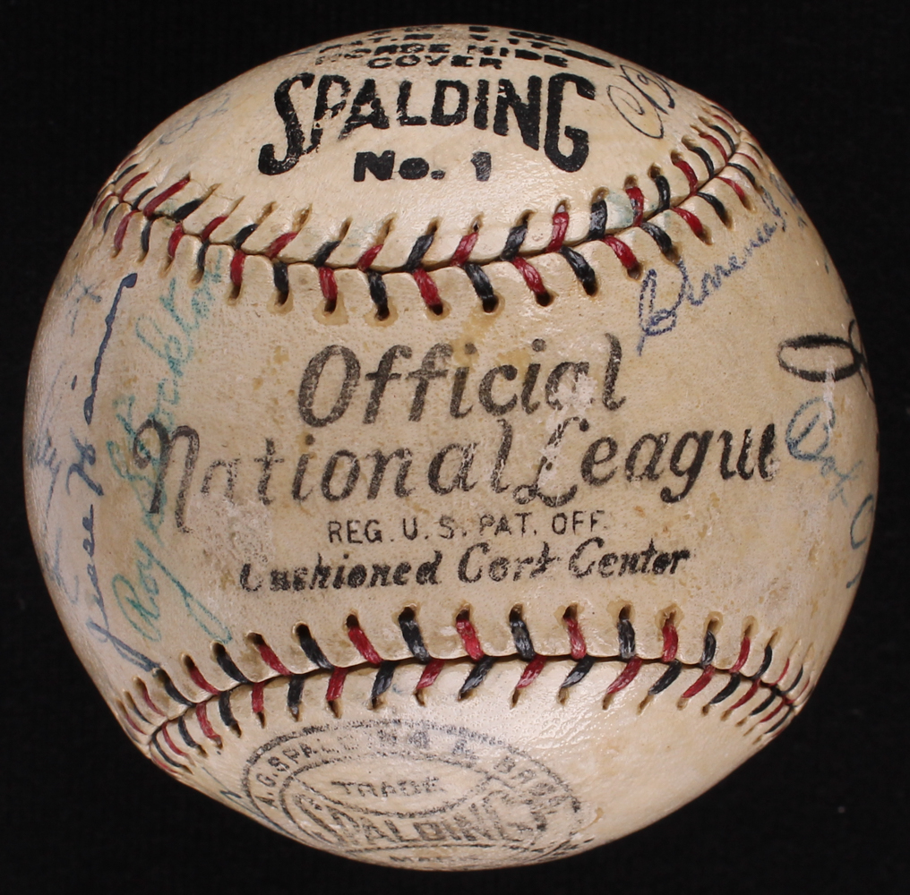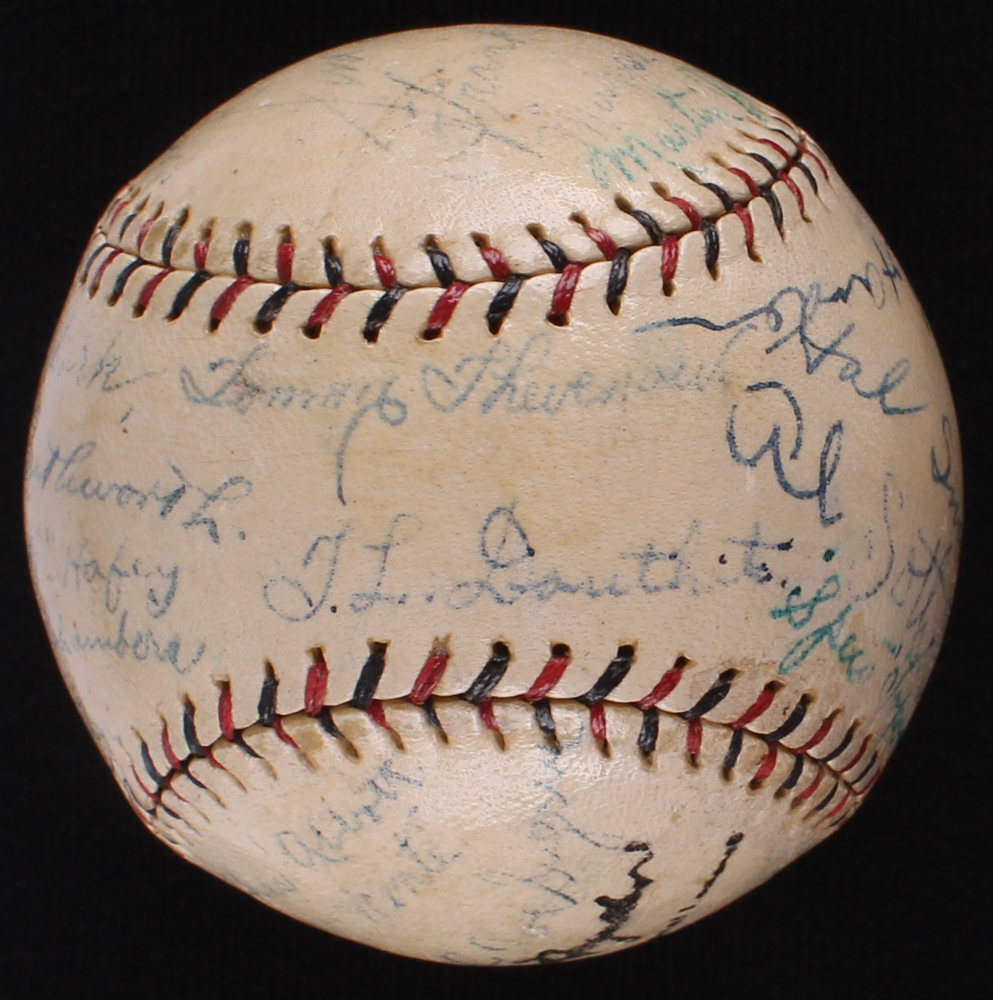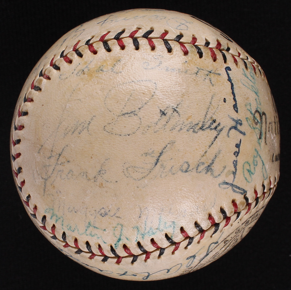 Vintage Official National League baseball has been hand signed in ink pen by (24) members of the 1927 St. Louis Cardinal including Frankie Frisch (HOF, D. 1973), Chick Hafey (HOF, D. 1973), Billy Southworth (HOF, D. 1983), Rabbitt Maranville (HOF, D. 1954), Jesse Haines (HOF, D. 1978), Grover Cleveland Alexander (HOF, D. 1950) and others. Please note that the Jim Bottomley autograph is a clubhouse signature.