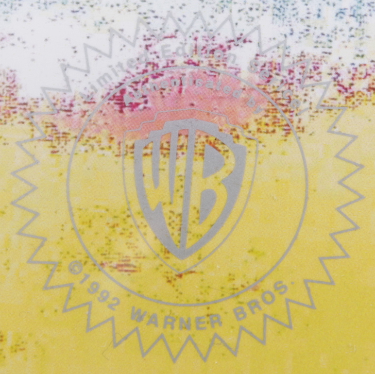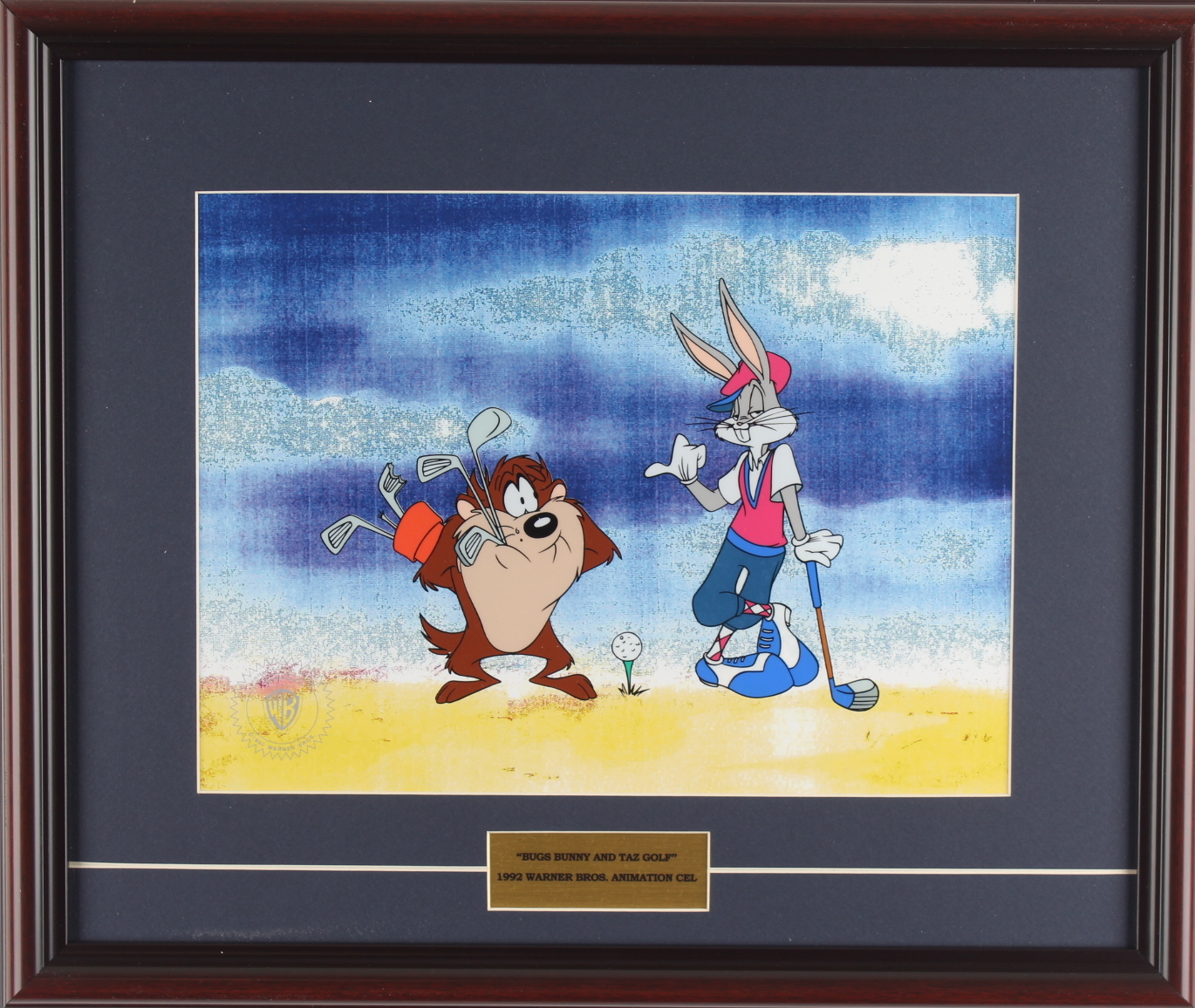 Custom frame measures 16" x 19" in size and features a two piece serigraph cel of Warner Bros "Bugs Bunny and Taz Golf".