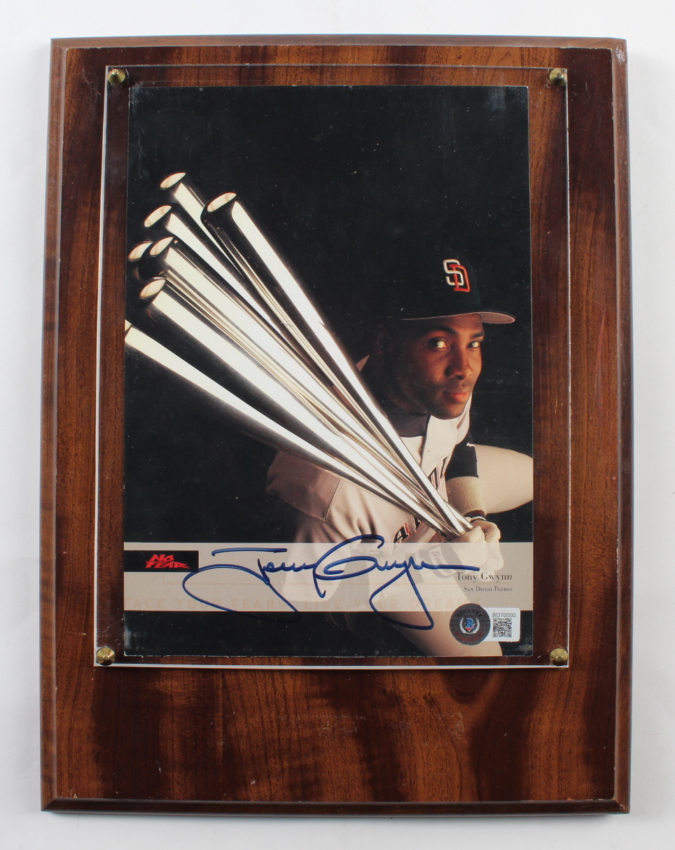 Plaque display measures approximately 9" x 12" in size and features a photo that has been hand-signed by Tony Gwynn (D. 2014, San Diego Padres, HOF). Please note, the plaque shows signs of wear.