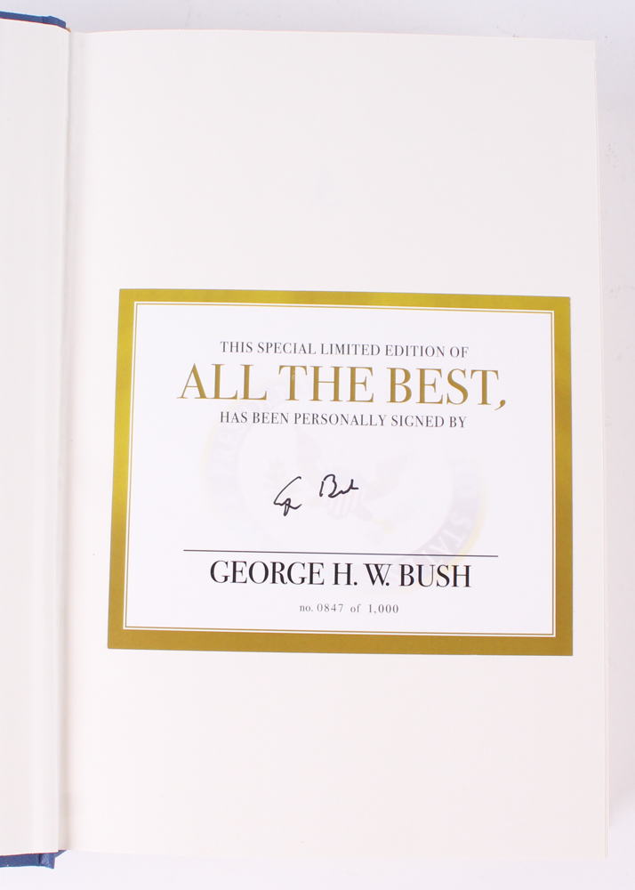 "All The Best, George Bush" hardback book has been hand-signed on the inside title page by George H. W. Bush (D. 2018, 41st President of the United States). Limited edition #847/1000.