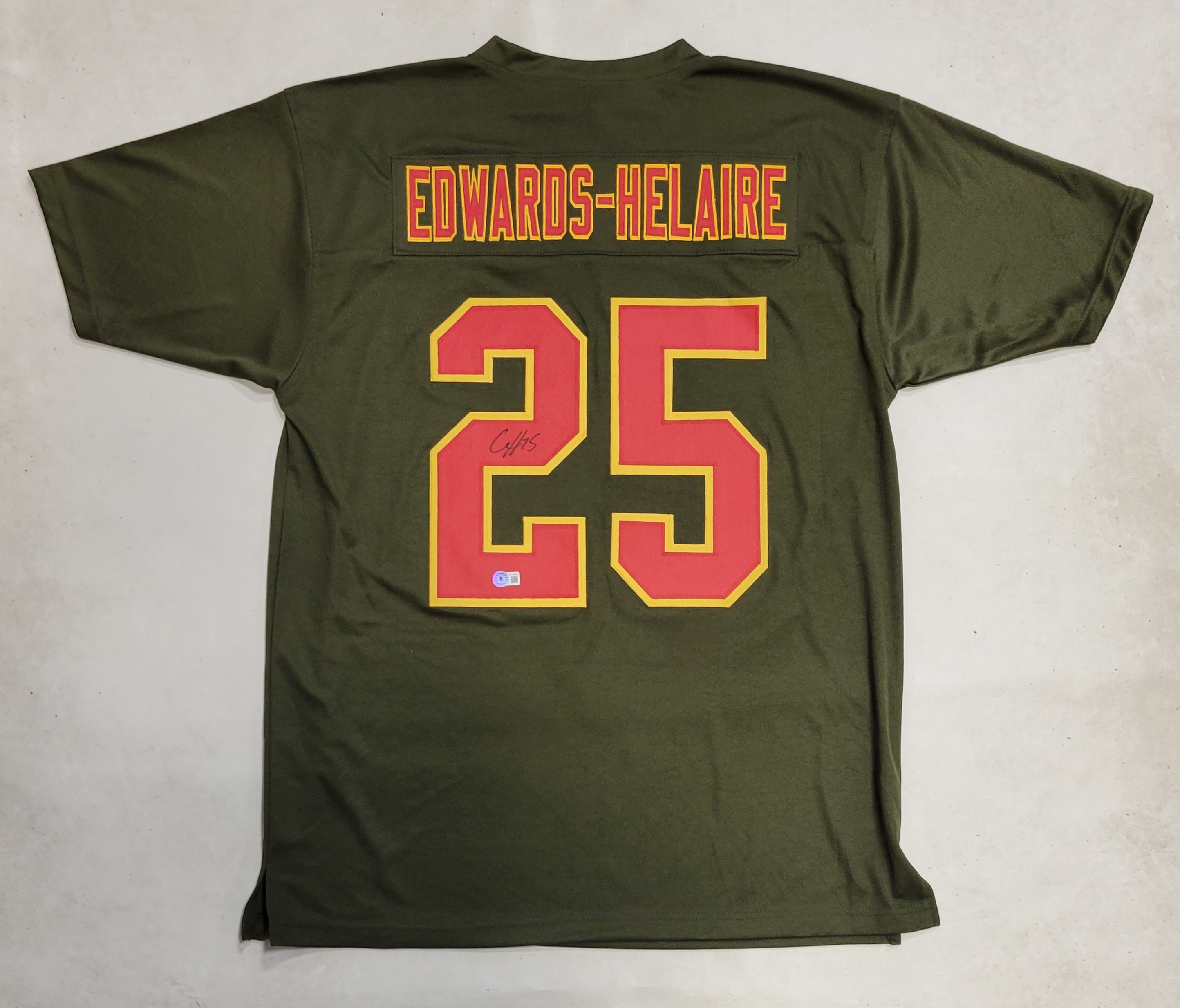 Custom on-field style jersey. Everything is sewn on, size XL. Hand-signed by Clyde Edwards-Helaire.