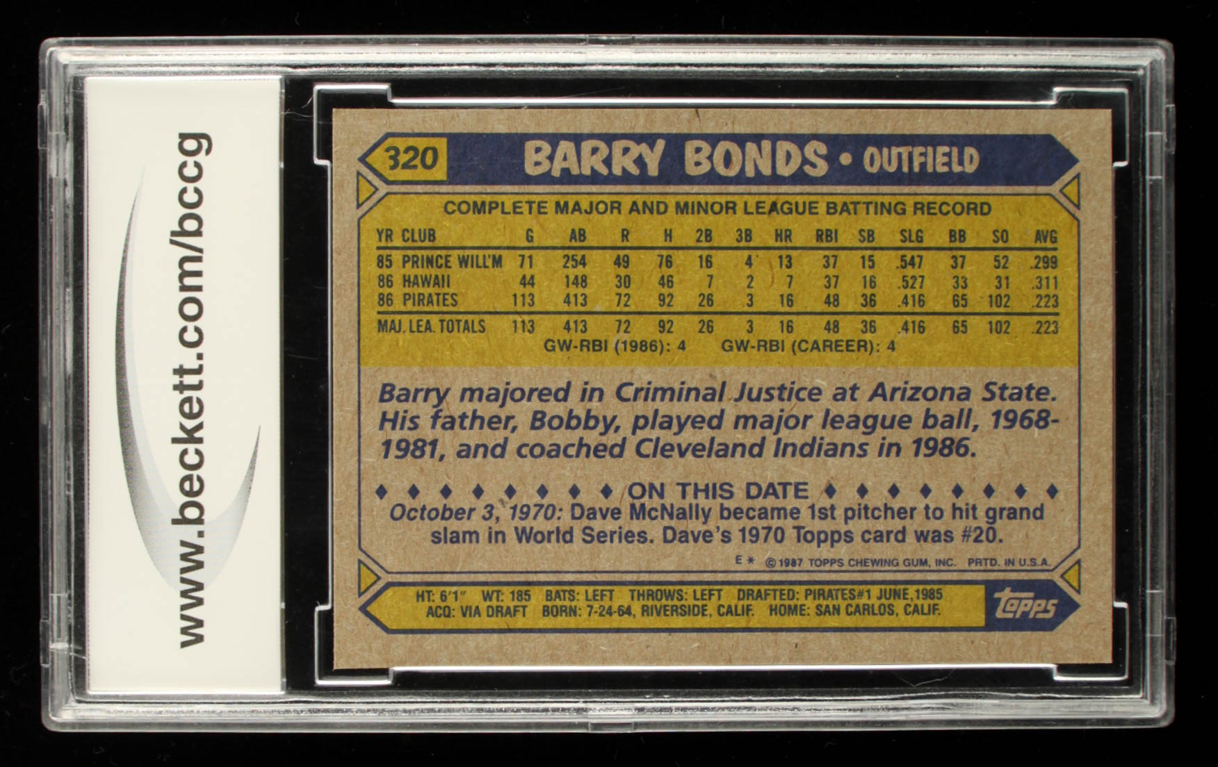 Barry Bonds 1987 Topps #320 RC (BCCG 10)