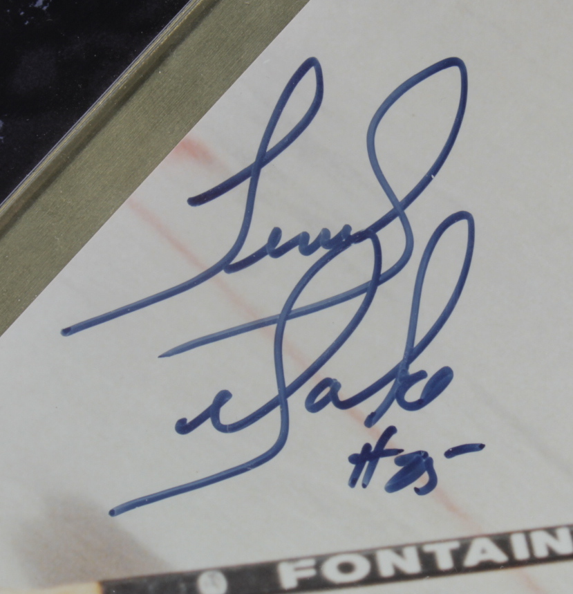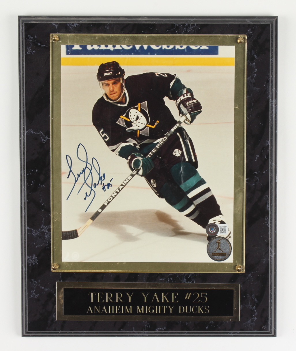 Plaque measures approximately 12" x 15" in size and features a photo and has been hand-signed by Terry Yake (Mighty Ducks of Anaheim). The display is limited edition numbered #039119. Please note, the display show signs of wear.