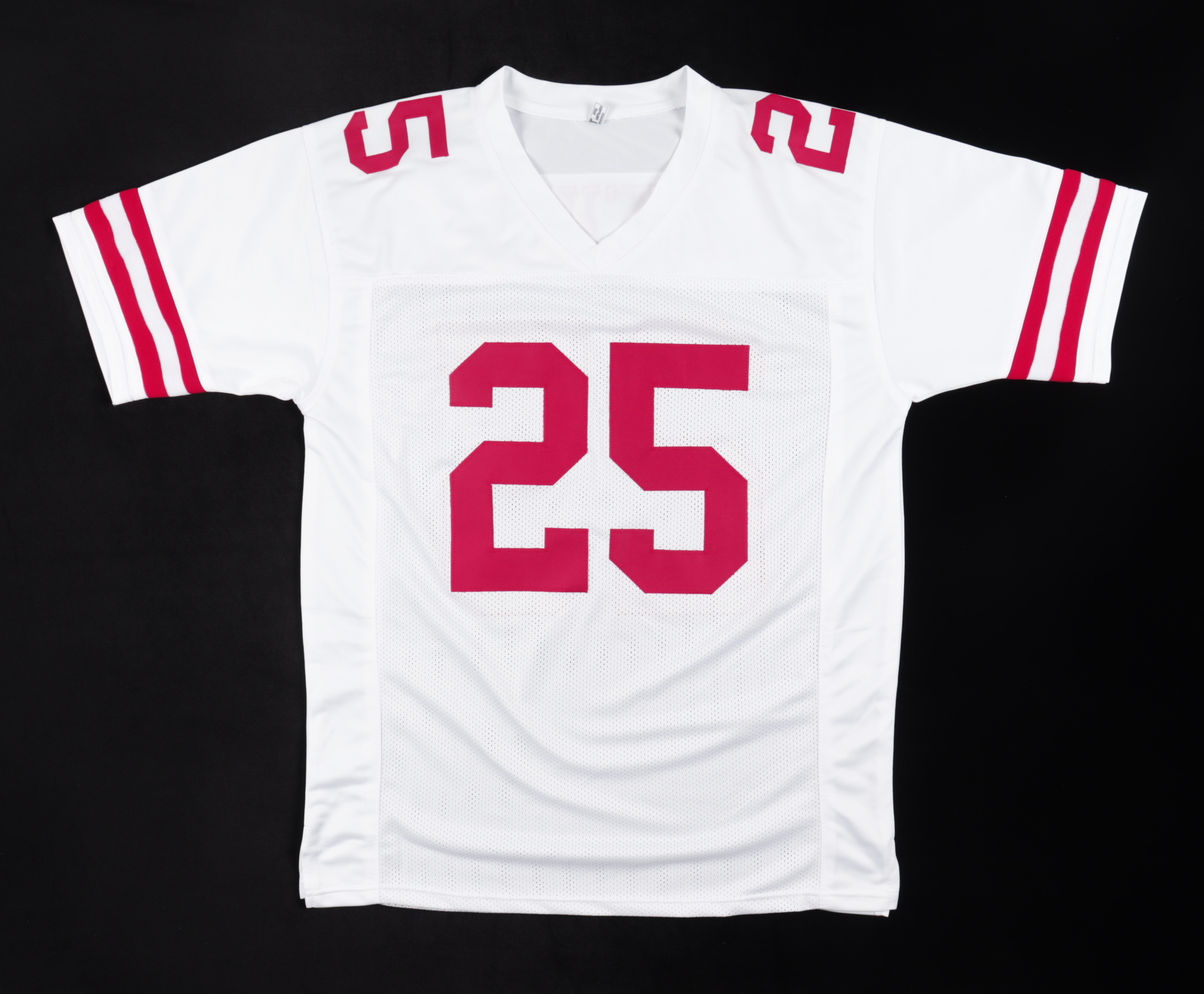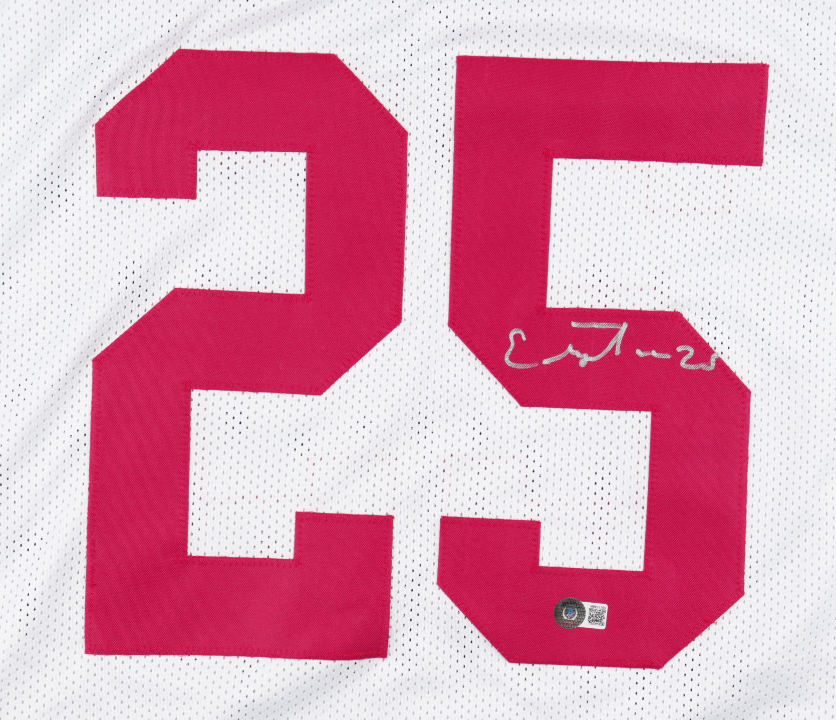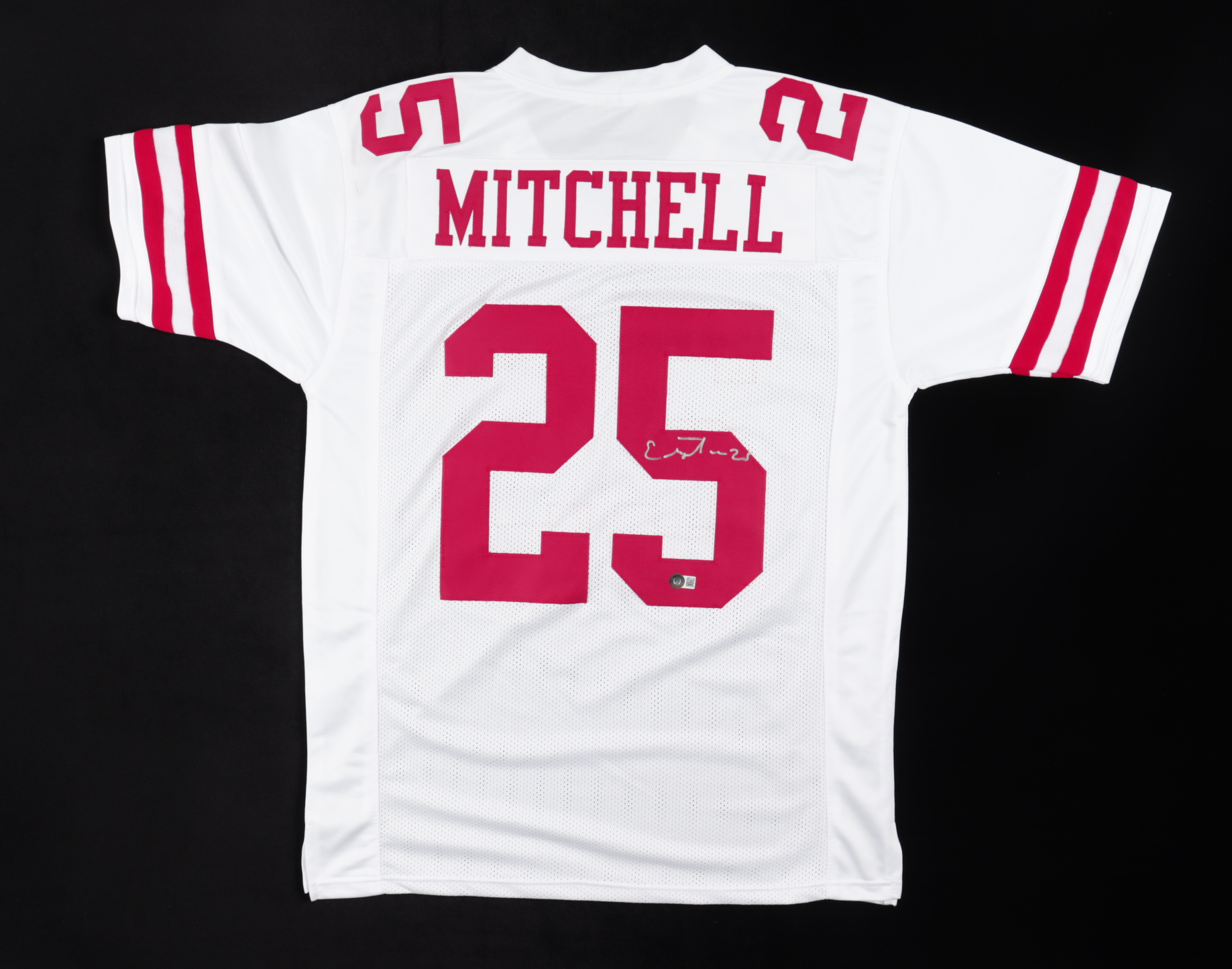 Custom on-field style jersey. Everything sewn on, size XL. Hand-signed by Elijah Mitchell.