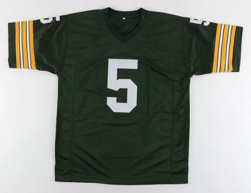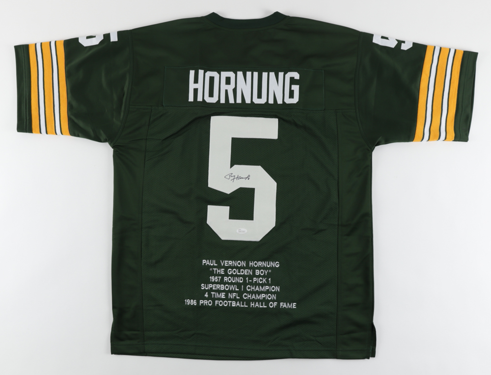 Custom on-field style jersey. Everything is sewn on, size XL. Hand-signed by Paul Hornung (D. 2020, HOF). Hornung's career highlights have been custom stitched onto the back of the jersey below the reverse numbers.