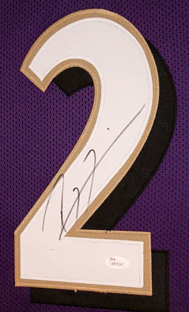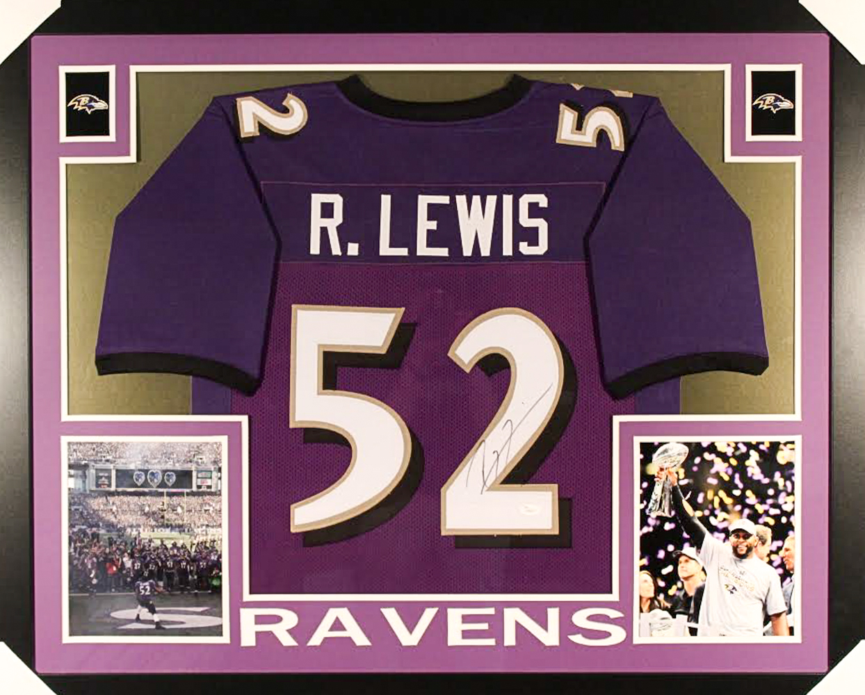 Custom frame measures approximately 35" x 43" in size and features a jersey which has been hand-signed in black felt-tip pen by Ray Lewis.