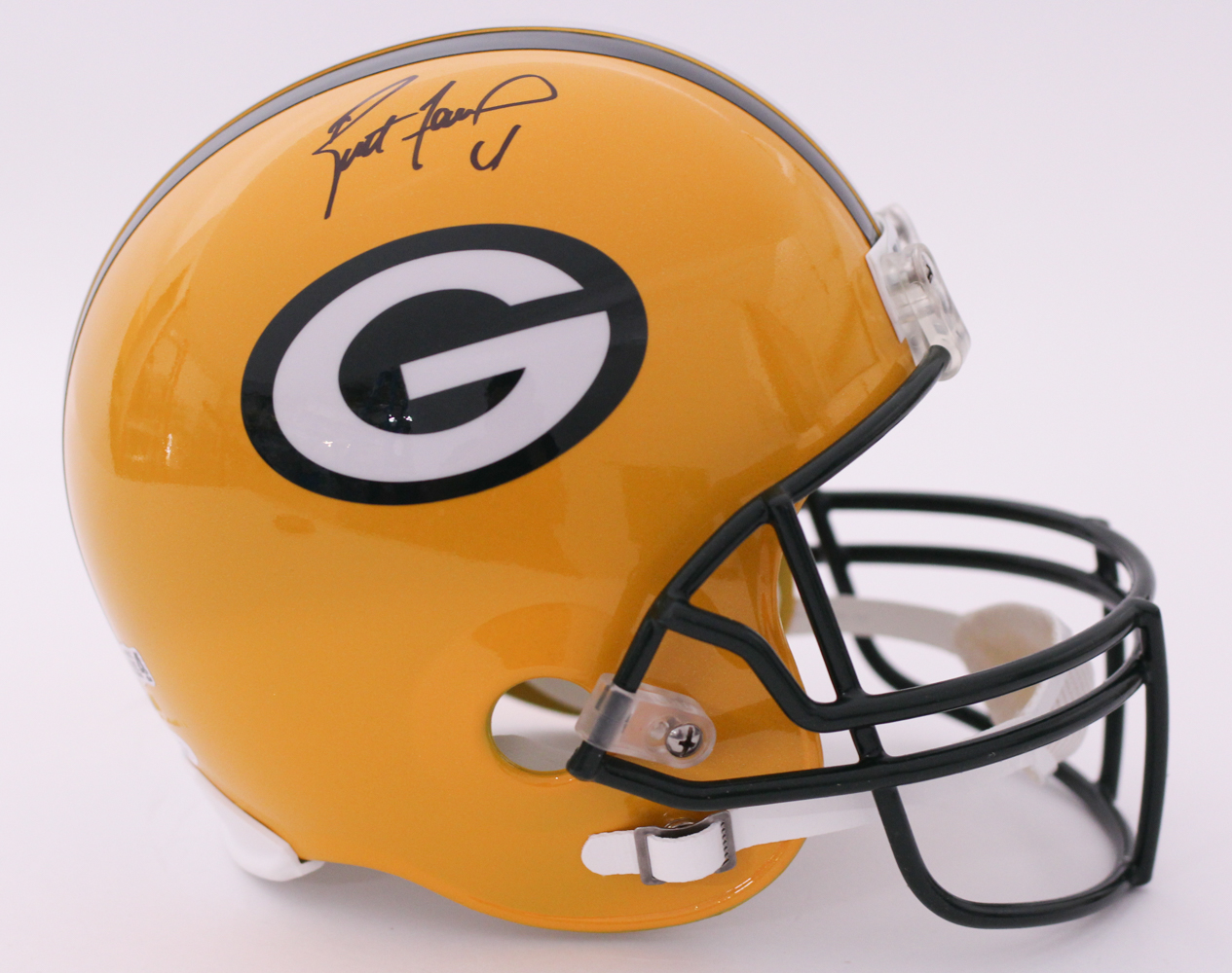 Packers full size replica helmet. Hand-signed in black felt-tip pen by Brett Favre (Packers, HOF).