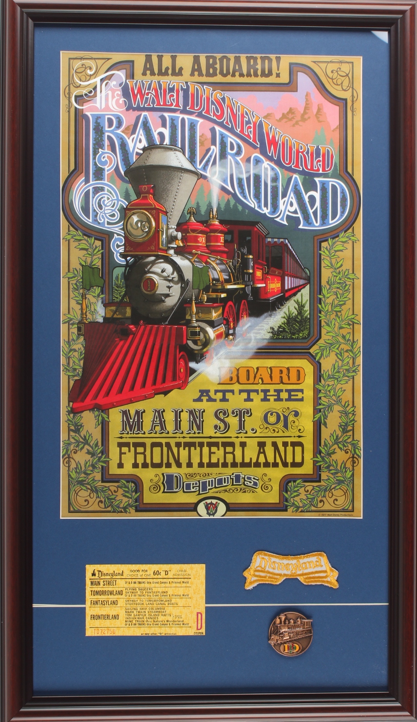 Disneyland Railroad 15x24 Custom Framed Poster Print Display with Railroad Pin, Vintage 1960's "D" Train Ticket & Vintage Employee Uniform Patch