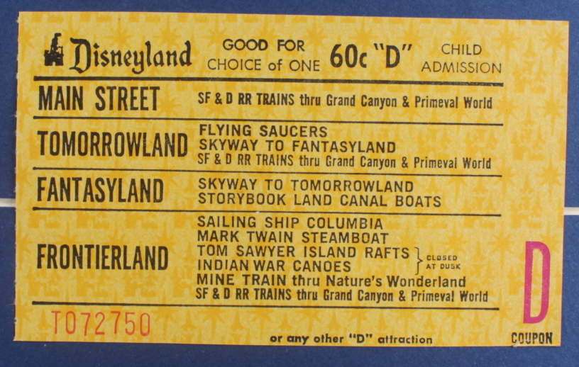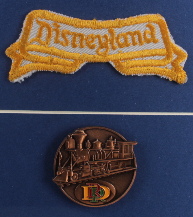 Custom framed display measures 15" x 24" in size. The display also includes a Disneyland Railroad Pin, vintage 1960's "D" train ticket and vintage employee uniform patch.