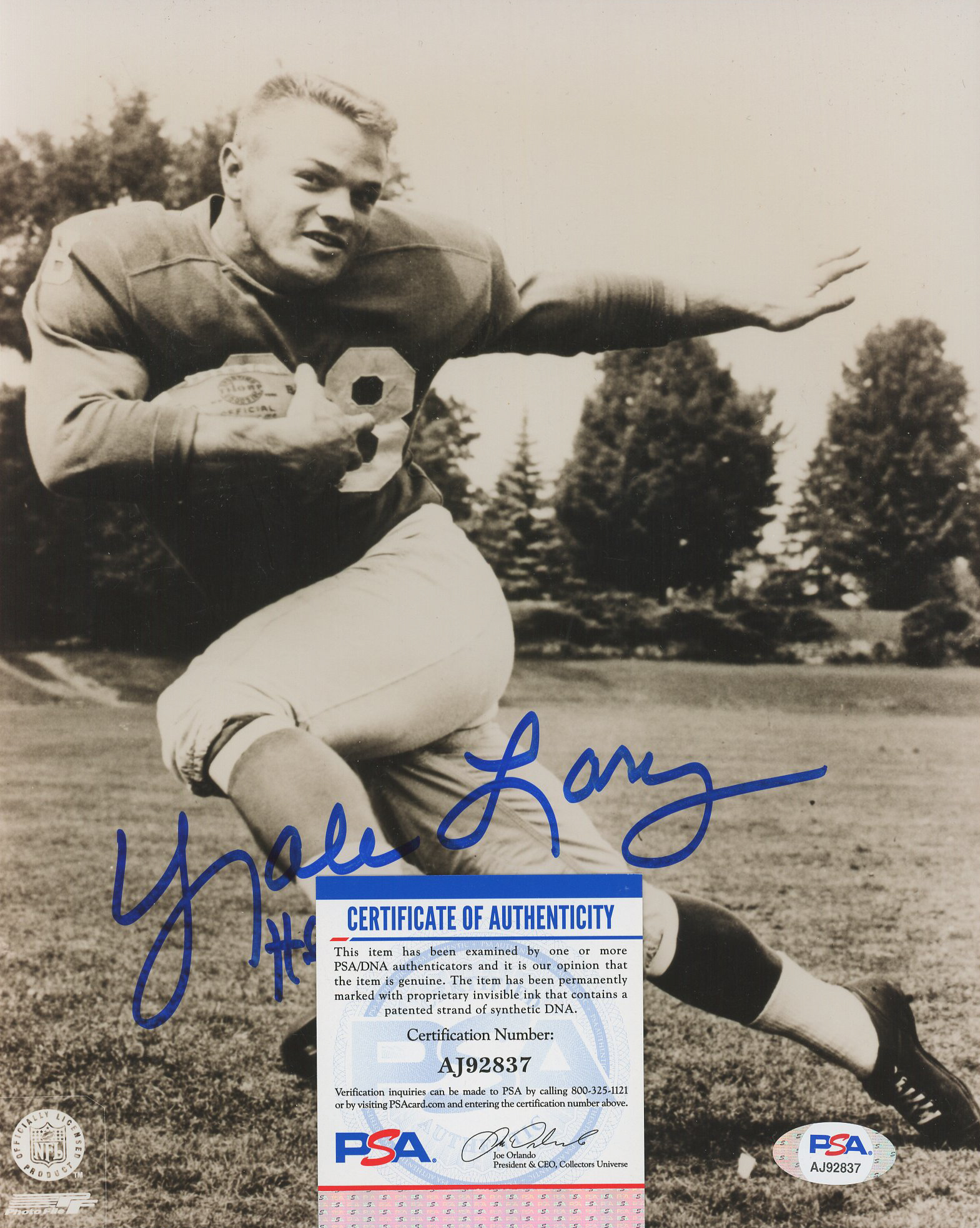 Photo measures 8" x 10" in size and has been hand-signed and inscribed by Yale Lary (D. 2017, Detroit Lions, HOF).