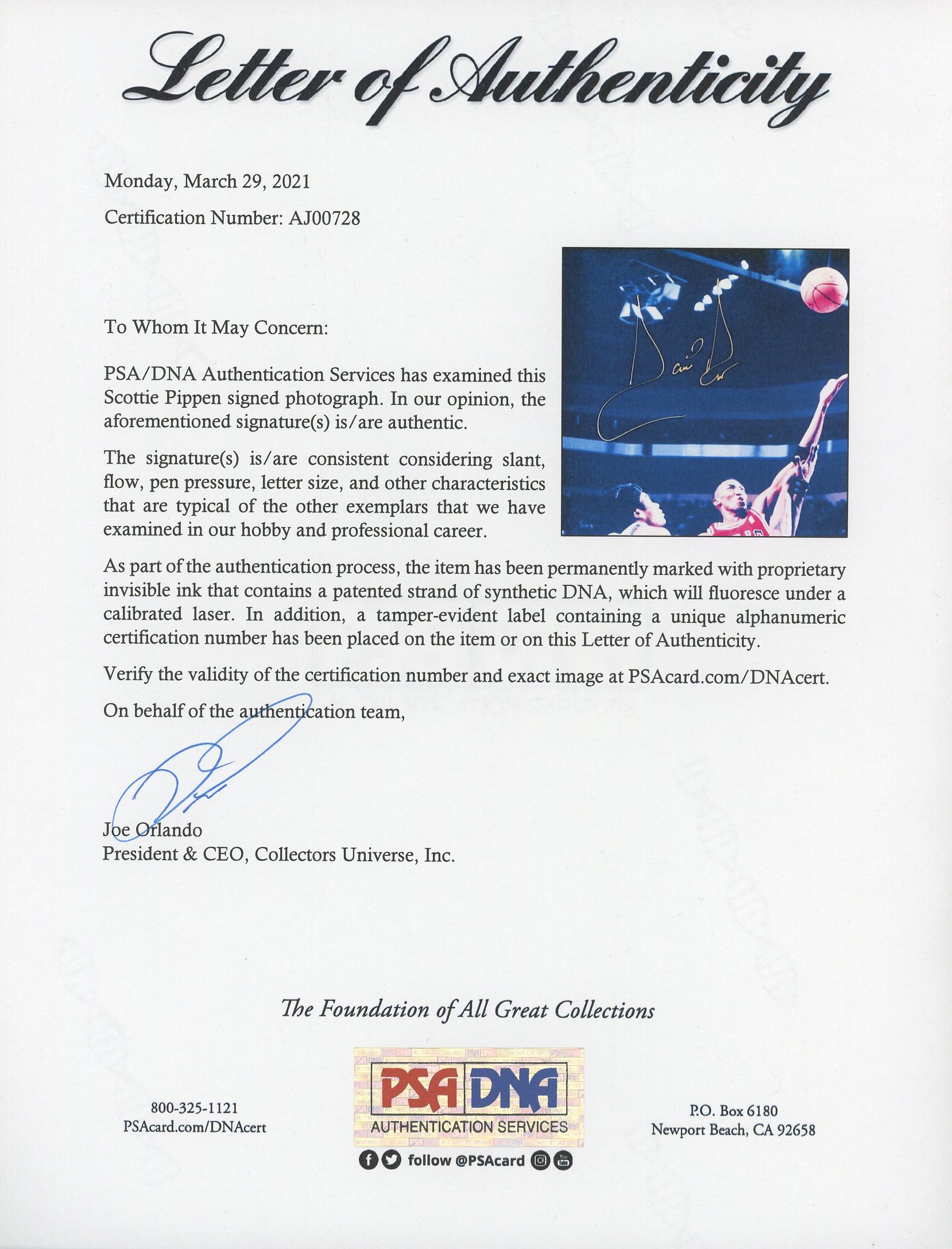 Photo measures 8" x 10" in size and has been hand signed by Scottie Pippen (Chicago Bulls, HOF).