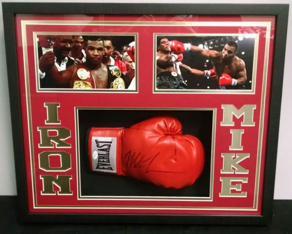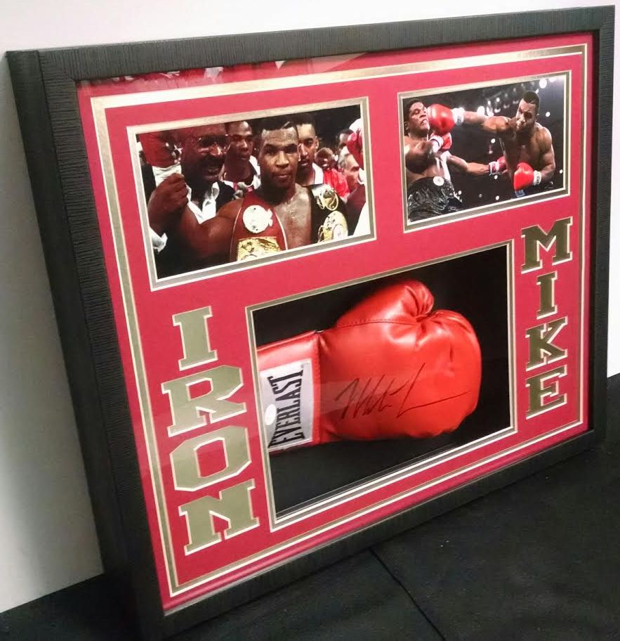 Shadowbox display measures approximately 21" x 25" x 4" in size and features a glove which has been hand-signed in black felt-tip pen by Mike Tyson.
