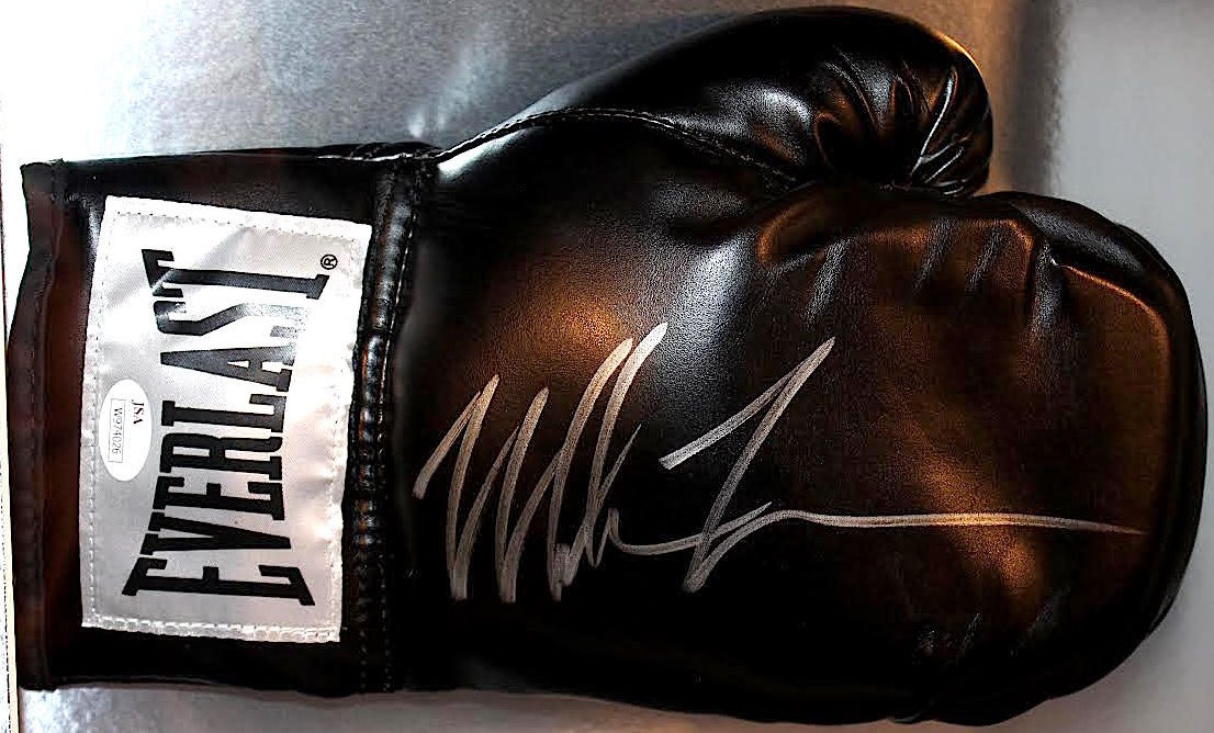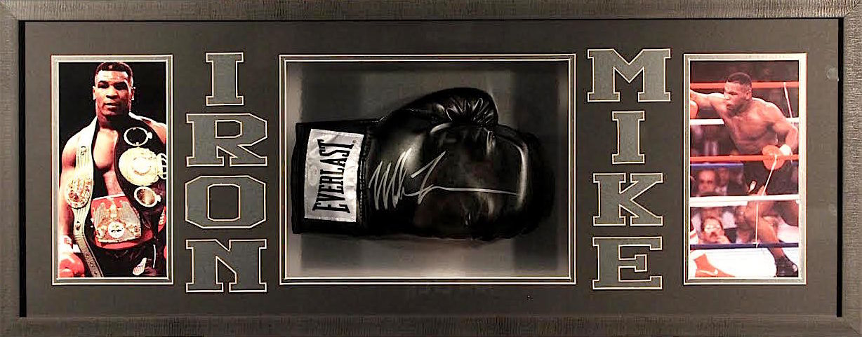 Shadowbox display measures approximately 39" x 15" x 4" in size and features a glove which has been hand-signed in silver paint pen by Mike Tyson.