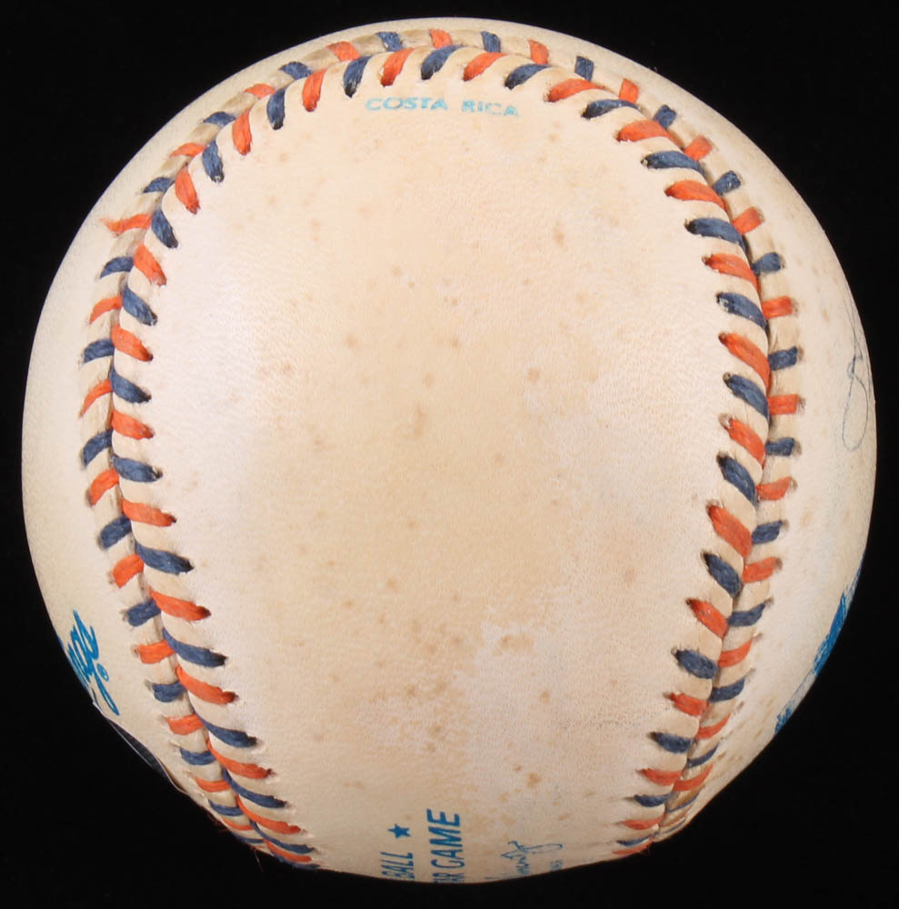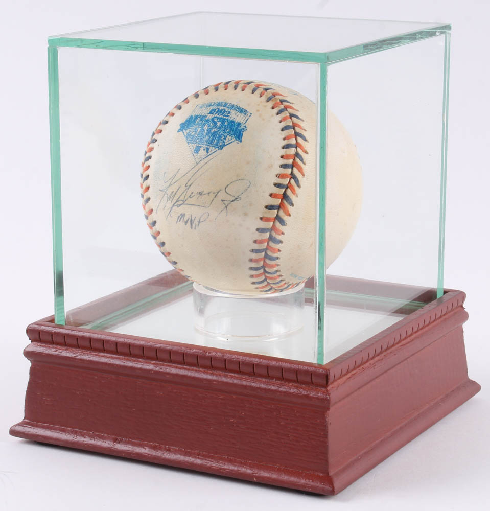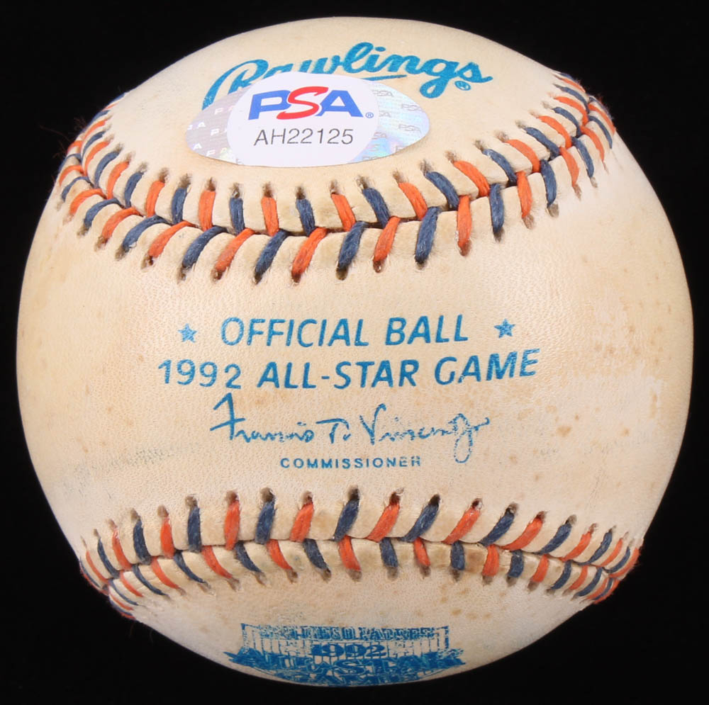 Rawlings Official 1992 All-Star baseball. Hand-signed in blue ink pen by Ken Griffey Jr. (Seattle Mariners, HOF). The auction also includes a Steiner display case with a wood base and glass cube. Please see photos for details regarding the condition of the baseball.