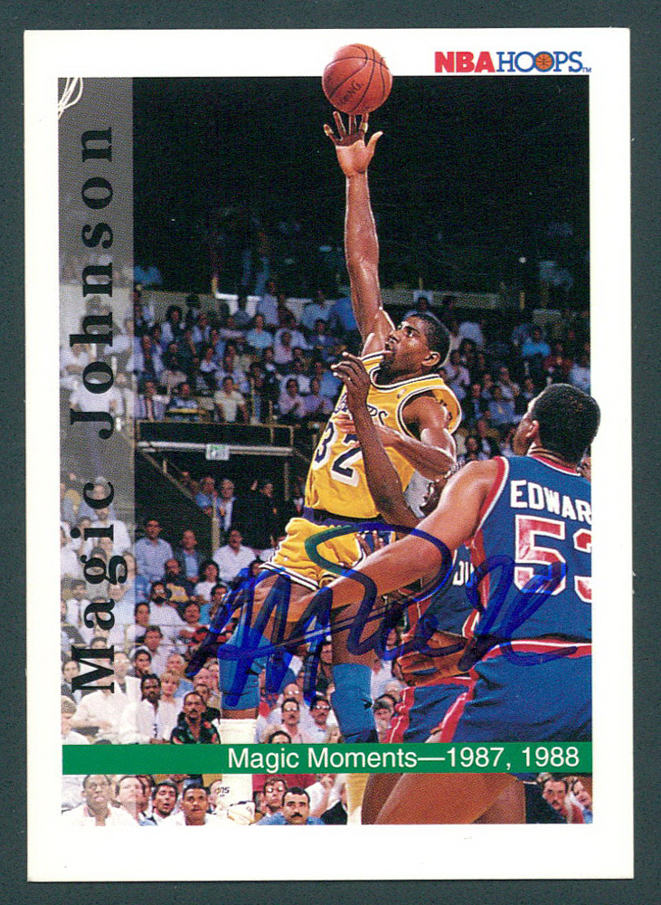 1992 SkyBox #330 Magic Johnson card has been hand-signed in blue felt-tip pen by Magic Johnson (Lakers HOF). Please see scans for details regarding the condition of the card