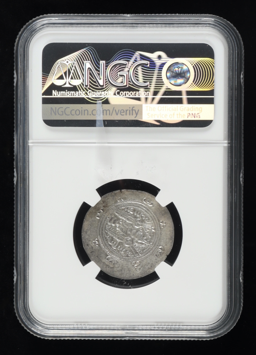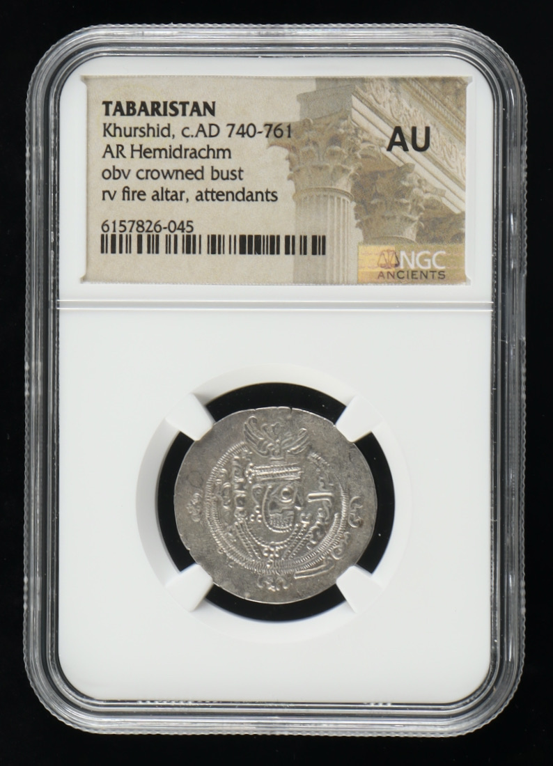 Khurshid (c.AD 740-761) Tabaristan AR Hemidrachm Ancient Silver Coin - Obv. Crowned Bust, Rev. Fire Altar, Attendants (NGC)