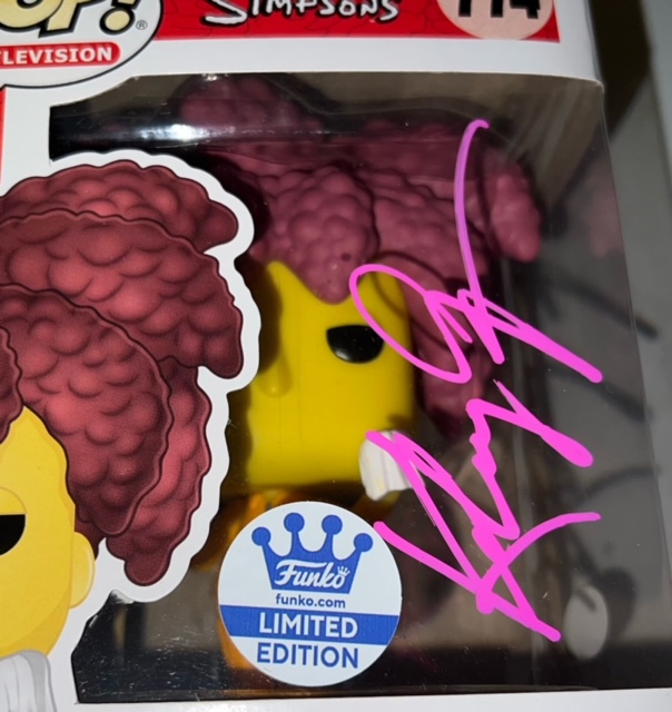Funko Pop! vinul figure measures approximately 4" tall and has been hand-signed on the packaging by Kelsey Grammer (Sideshow Bob). The figure is limited edition. Please note, this box has been window swapped.