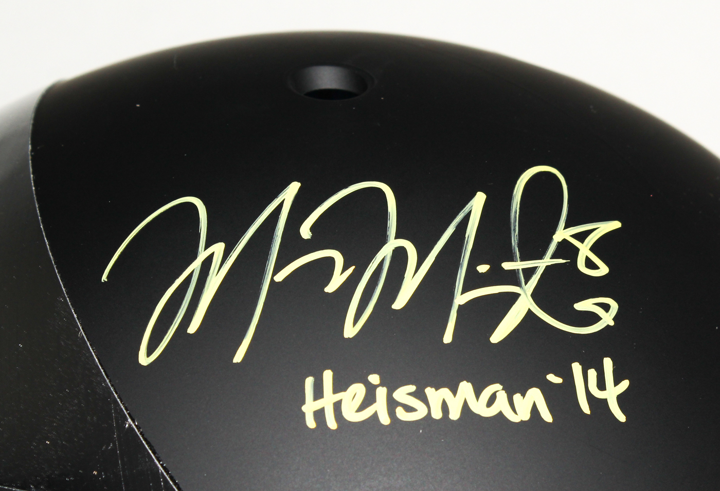 Schutt full-size authentic proline custom matte black & chrome helmet. Hand-signed and inscribed in yellow paint pen by Marcus Mariota (Titans). Helmet is limited edition and has been hand-numbered #8/14.