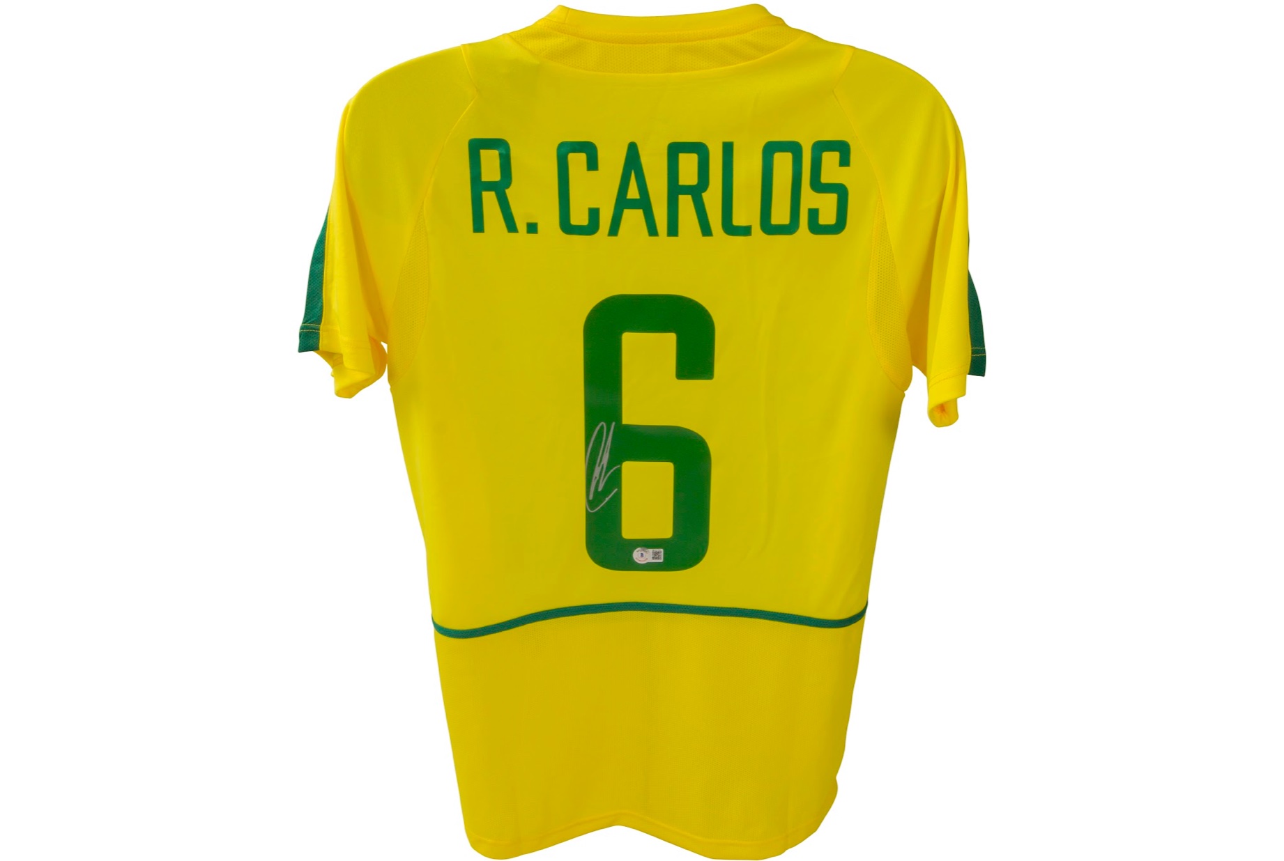 Nike on-field style jersey. Everything is printed on, size XL. Hand-signed by Roberto Carlos.