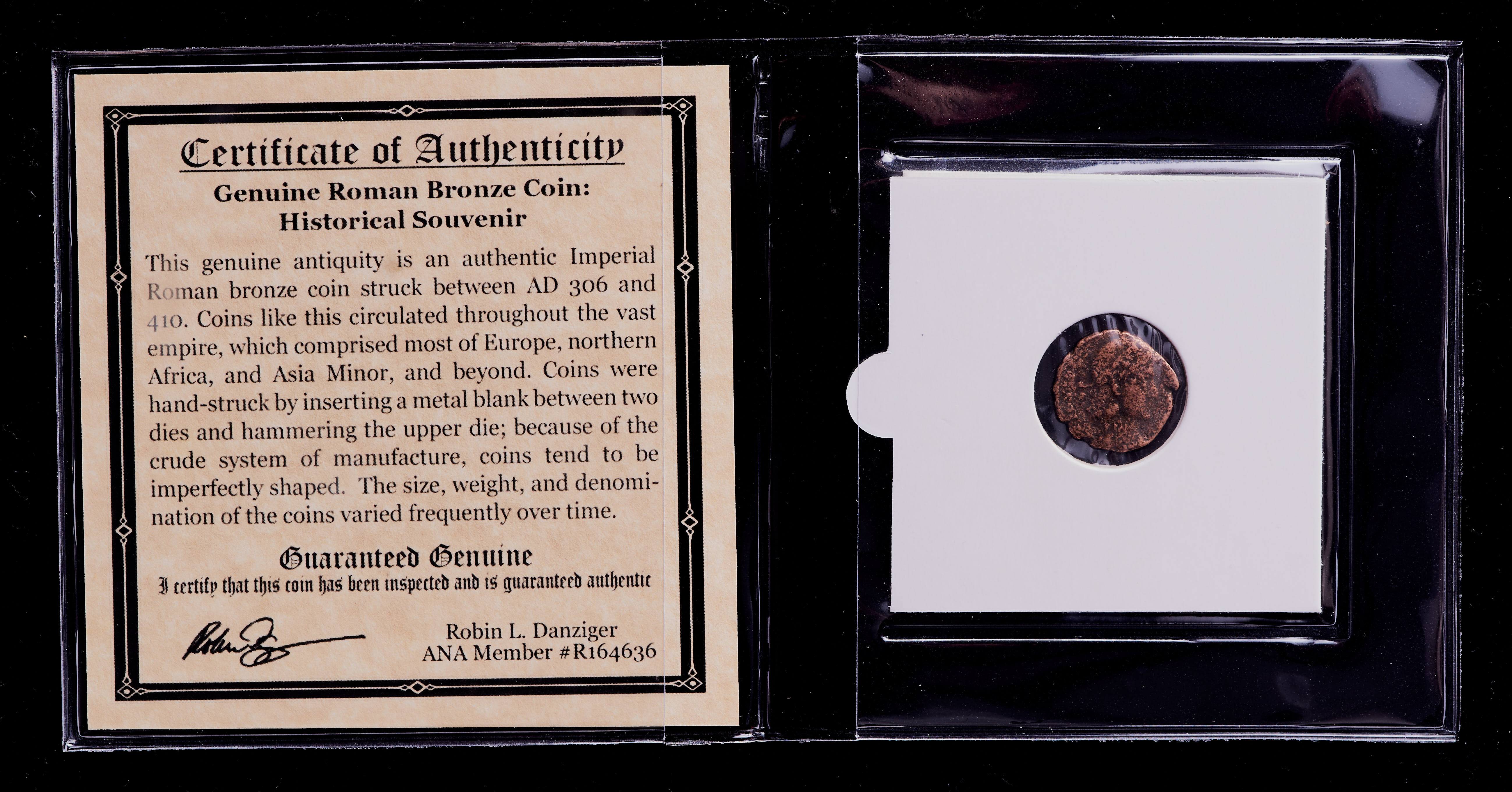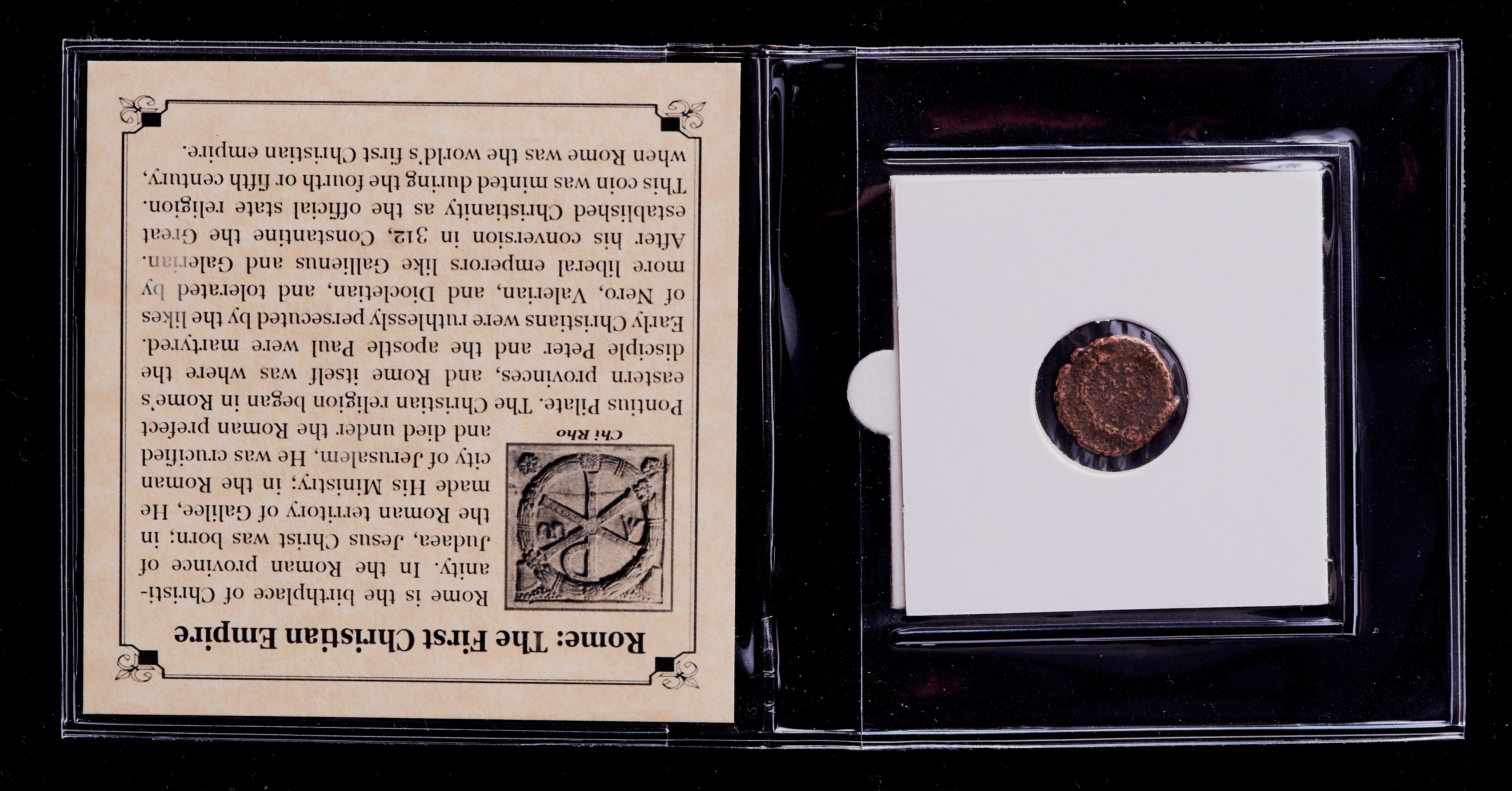 Rome is the birthplace of Christianity. The Christian religion began in Rome’s eastern provinces. This is an authentic Imperial Roman bronze coin struck between AD 306 and 410. Coins like this circulated throughout the vast empire, which comprised most of Europe, northern Africa, and Asia Minor, and beyond.This coin was minted during the fourth or fifth century, when Rome was the world’s first Christian empire.