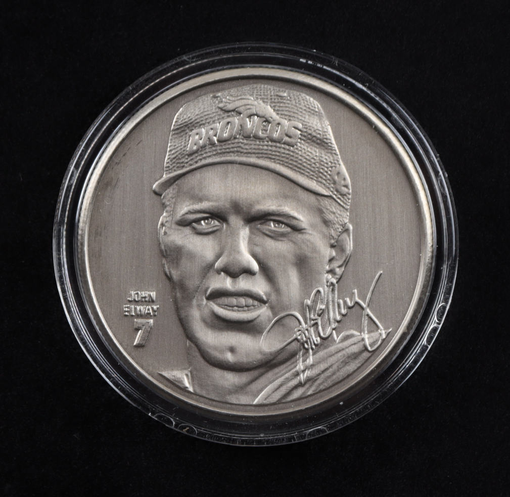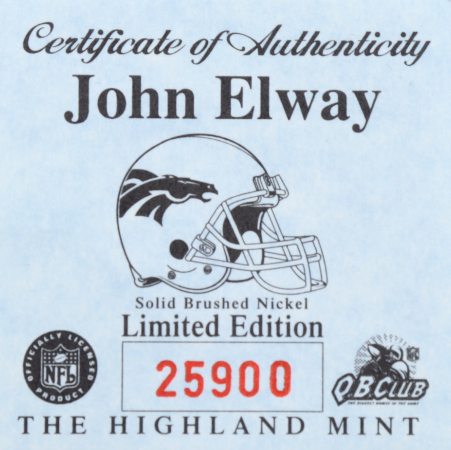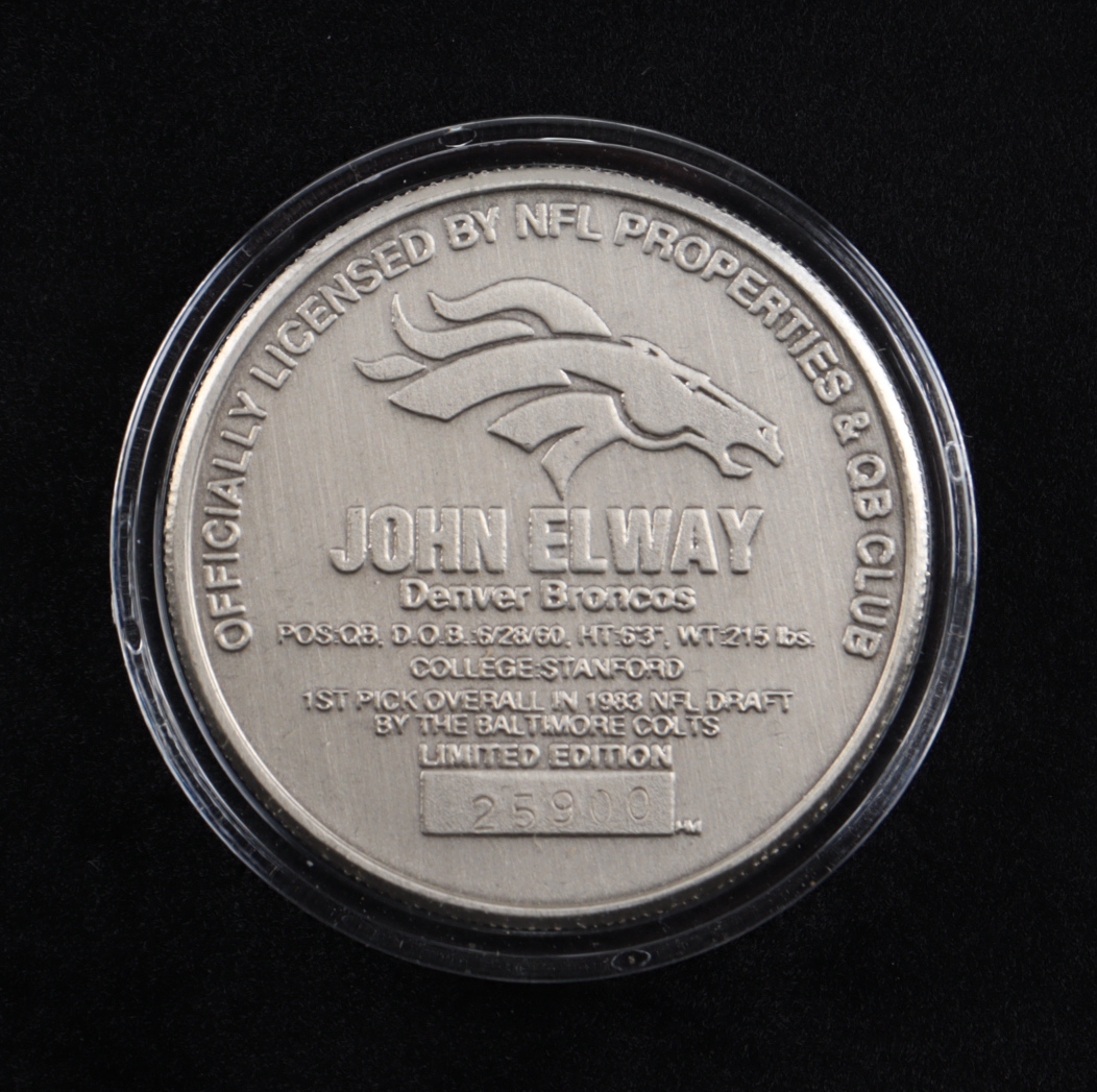 Limited edition #25,900 John Elway solid brushed nickel coin includes case.