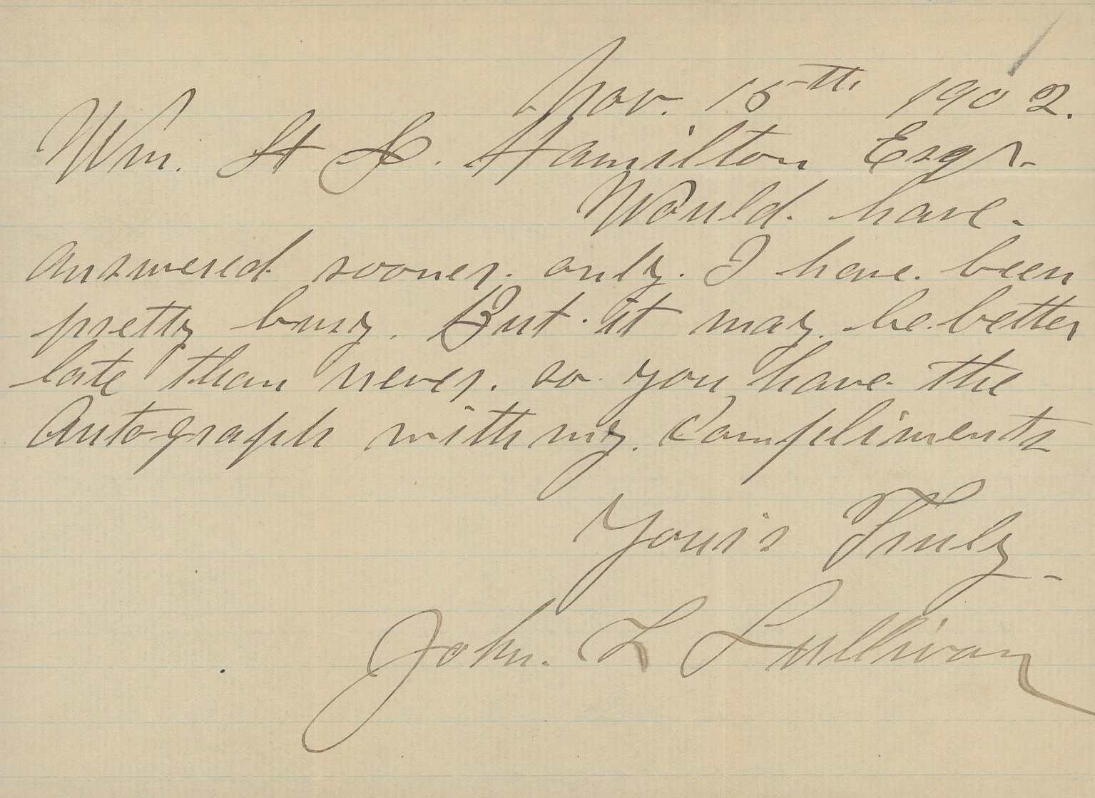 Hand-written letter is dated November 16, 1902, and measures approximately 6" x 8" in size. Hand-signed and inscribed by John L. Sullivan (D. 1918, HOF).