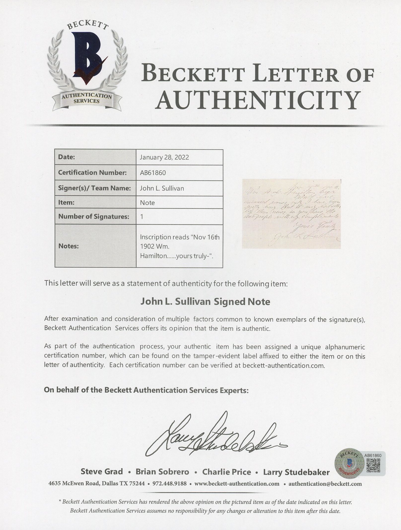 John L. Sullivan Signed Hand-Written Letter (Beckett)