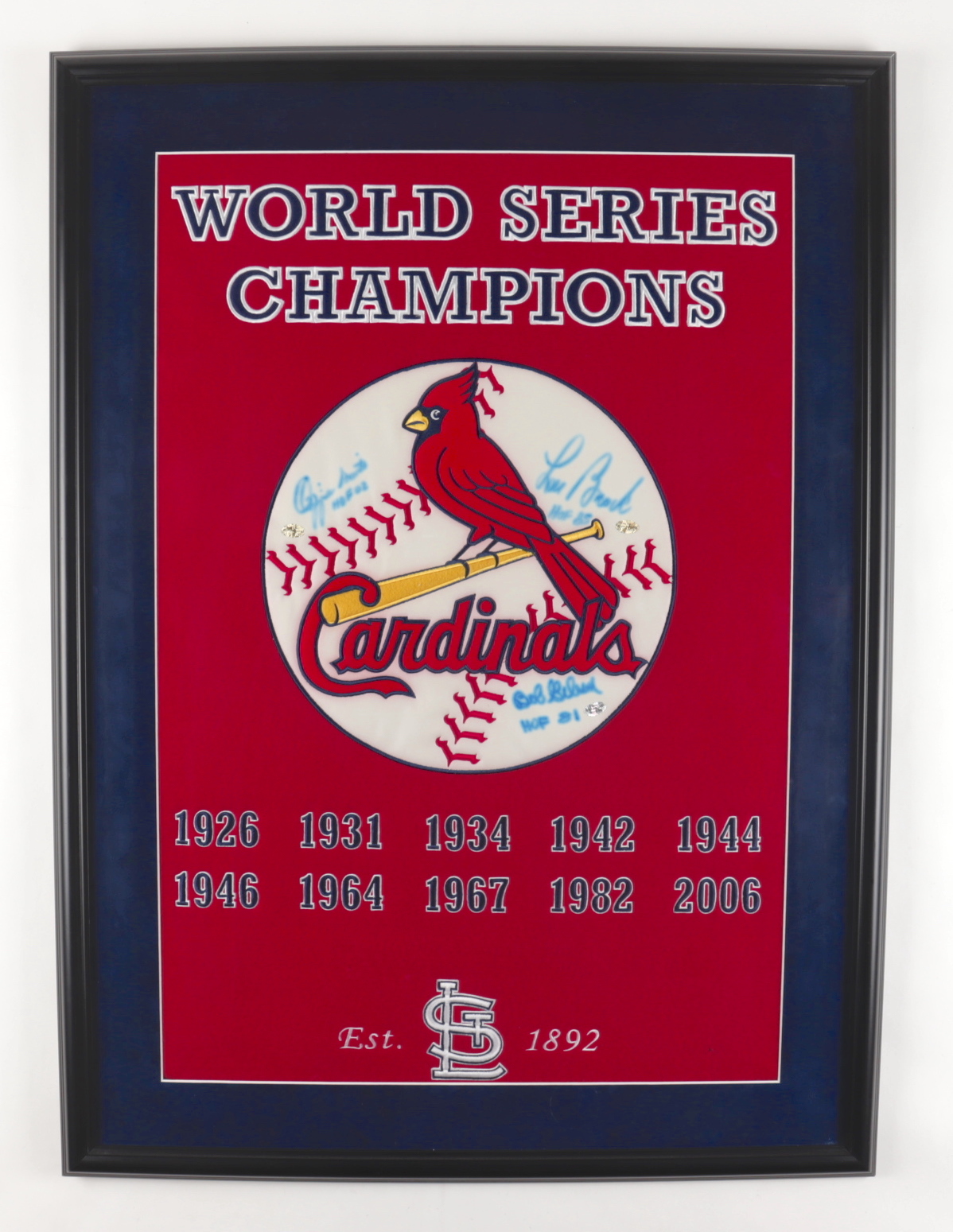 Custom frame measures 28" x 38" in size and features a photo that has been hand-signed by Ozzie Smith (St. Louis Cardinals, HOF), Lou Brock (D. 2020, St. Louis Cardinals, HOF), & Bob Gibson (D. 2020, St. Louis Cardinals, HOF).