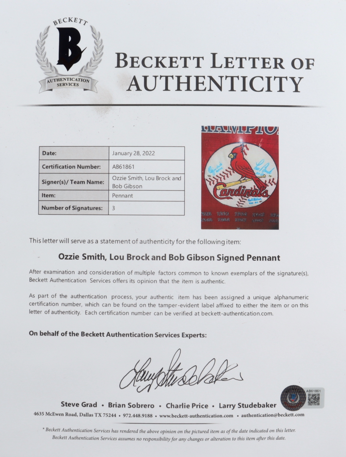 The lot / autograph(s) includes an official Beckett Authentication Services hologram and matching LOA for authenticity purposes.