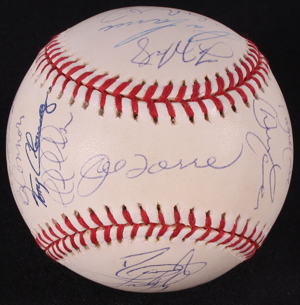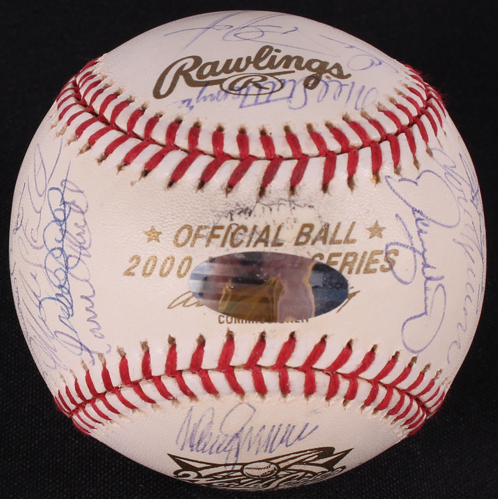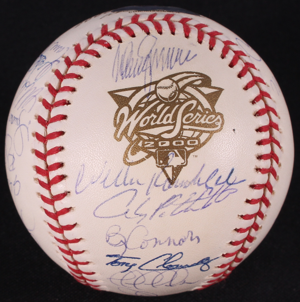 Rawlings Official 2000 World Series baseball. Hand-signed in blue ink pen by the 2000 Yankees Team: Derek Jeter, Joe Torre, Mariano Rivera, Andy Pettitte, Roger Clemens, Don Zimmer, Willie Gooden, David Cone, Tino Martinez, Jose Canseco, Dave Justice, Paul O'Neil & Mike Stanton.