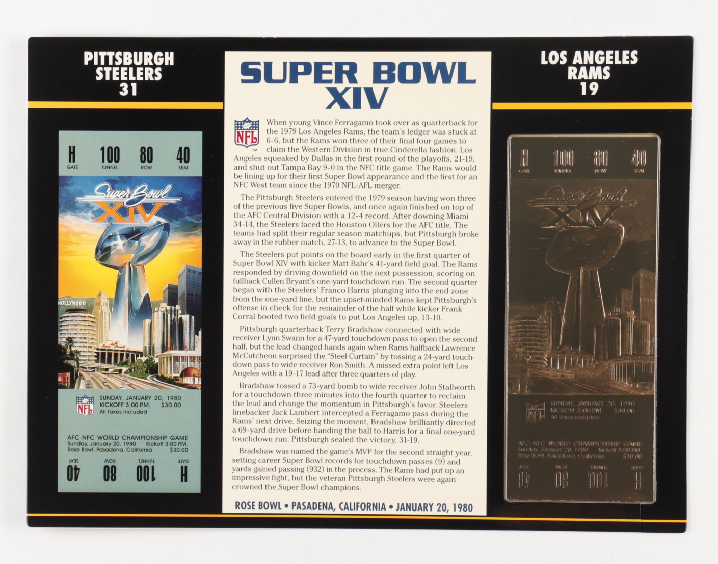 1980 Commemorative Super Bowl XIV Card with Ticket: Steelers vs Rams