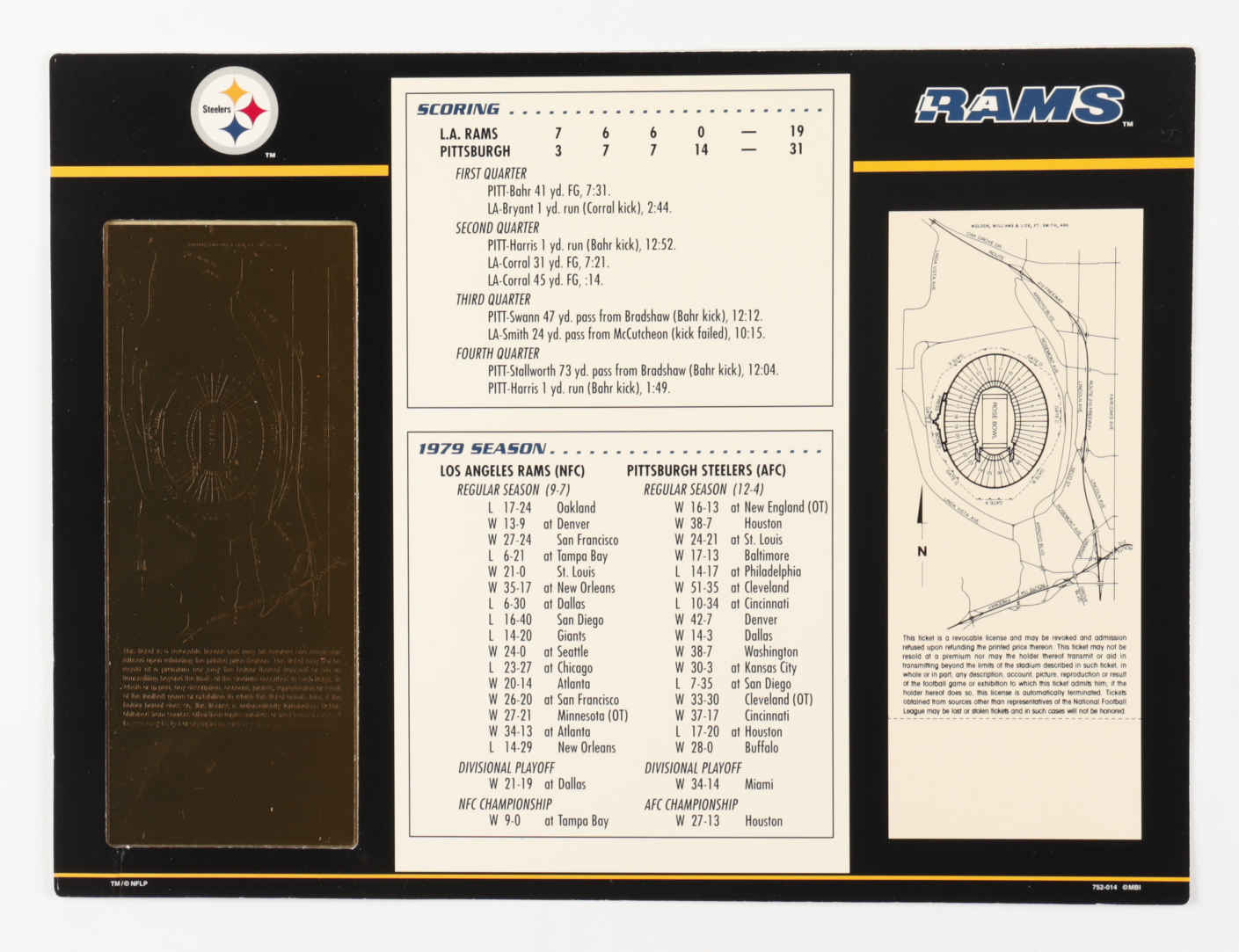 Official scorecard measures 9" x 12" in size with game stats on the reverse side. Features a Pittsburgh Steelers vs Los Angeles Rams replica gold Super Bowl XIV ticket.
