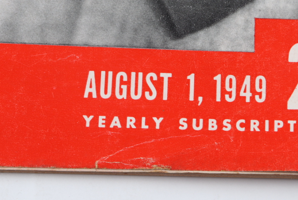 Magazine is dated August 1, 1949. Features Joe DiMaggio (D. 1999, New York Yankees, HOF) on the front cover.